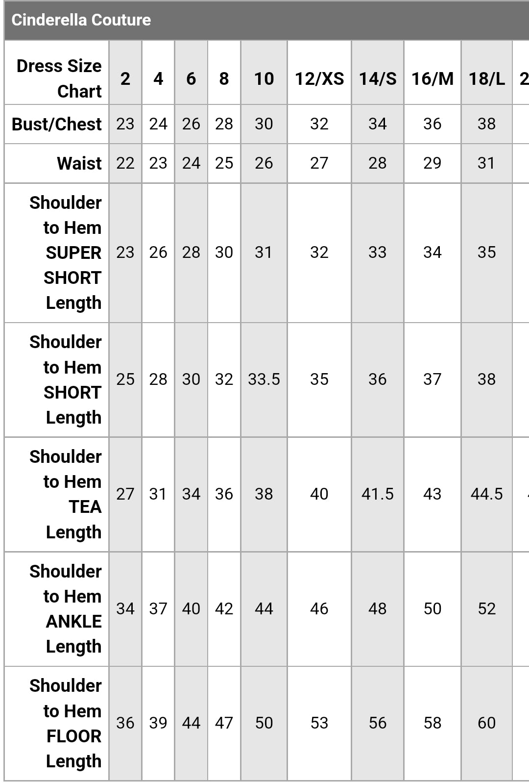 To ensure the perfect fit make sure you choose a larger size if you are in between two sizes. Also keep in mind that the dress may not be an exact fit and therefore may need alterations by your local tailor*