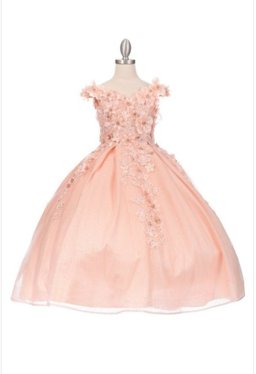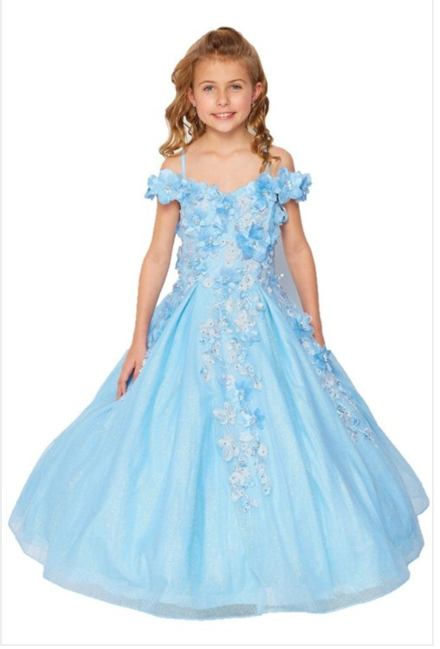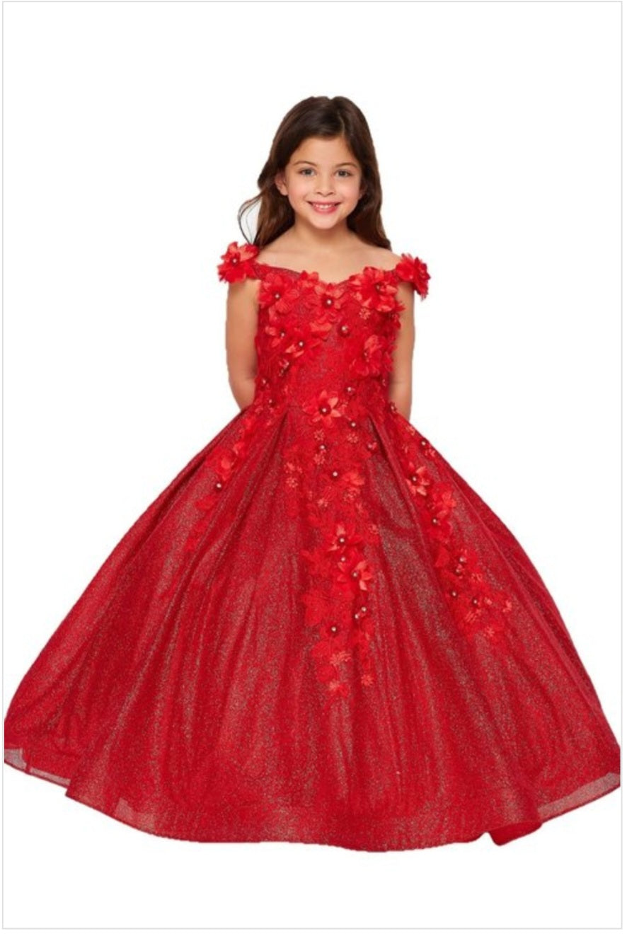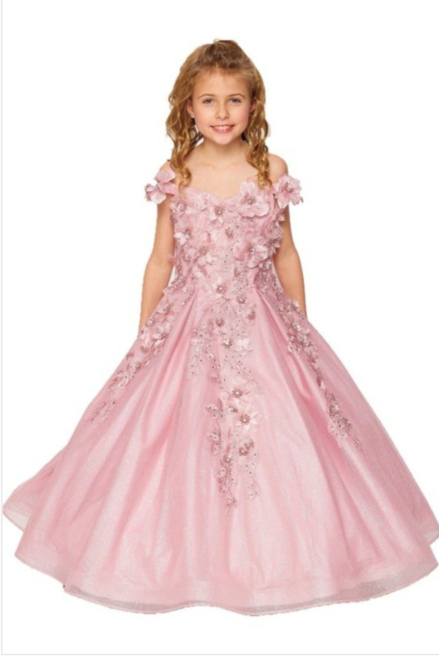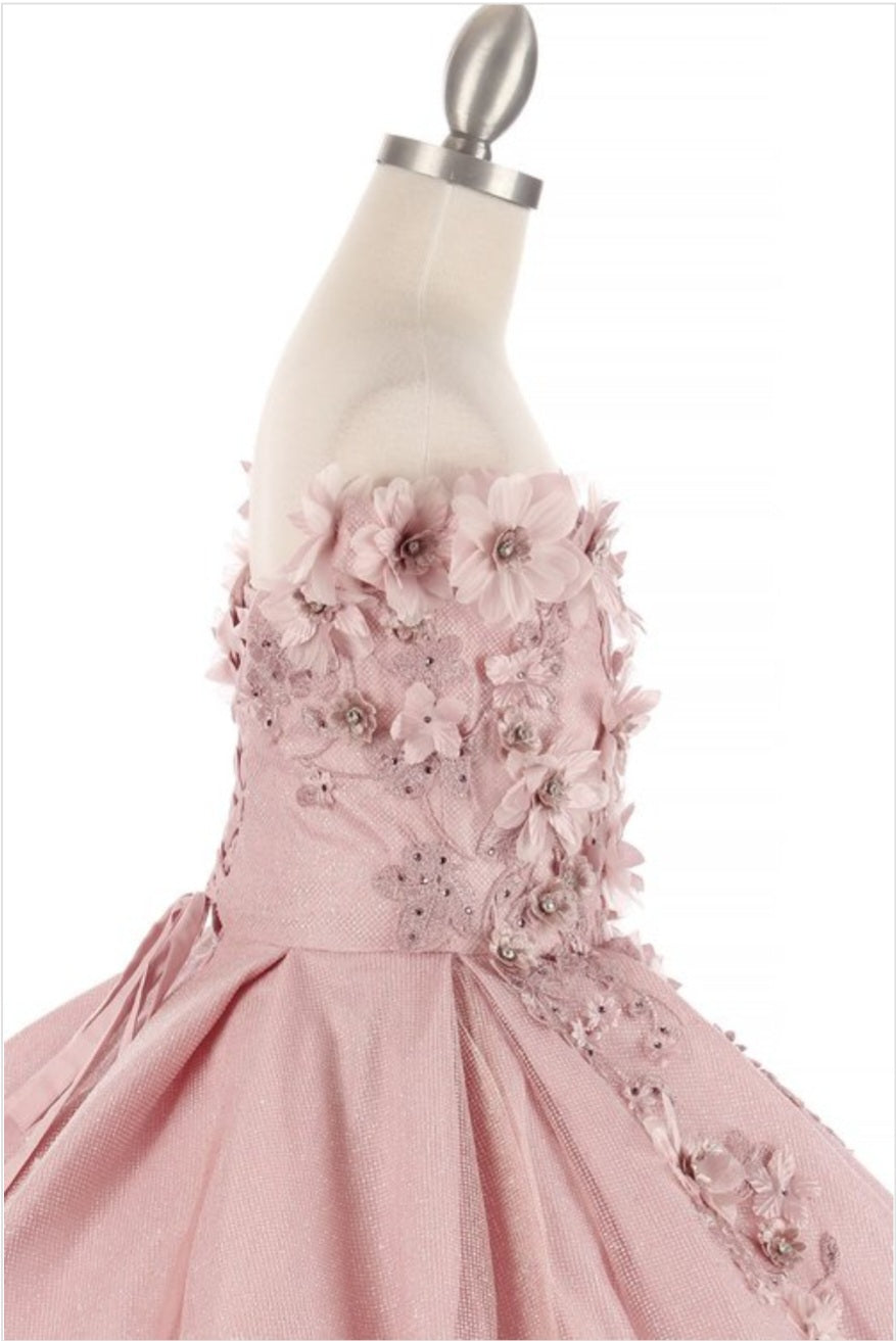 Your sweet girl will light up the room in this 3D floral long off shoulder glitter dress with A-line skirt. This beautiful ballgown features an off-shoulder sweetheart bodice embellished with 3D floral appliques, open lace-up corset back, and a floor length A-line skirt.