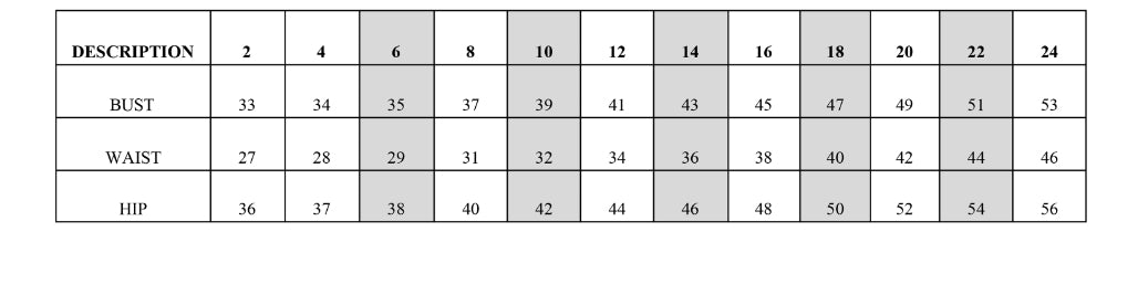 To ensure the perfect fit make sure you choose a larger size if you are in between two sizes. Also keep in mind that the dress may not be an exact fit and therefore may need alterations by your local tailor*