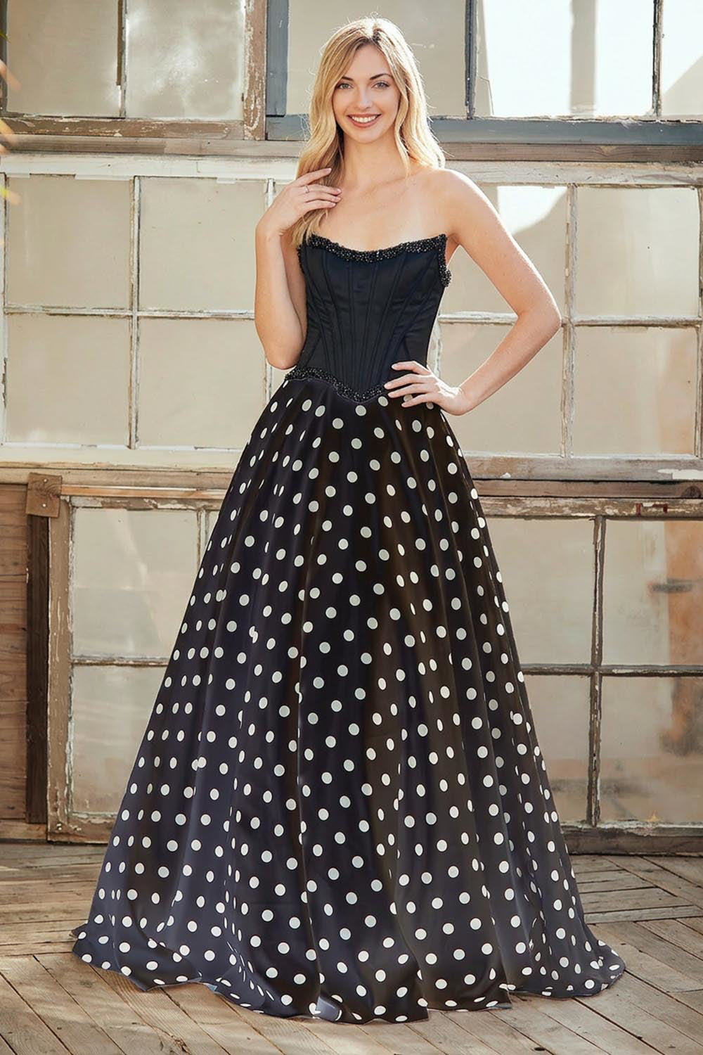 This enchanting two-piece set combines timeless elegance with regal sophistication. Designed with a sculpted satin corset bodice, it features delicate crystal embellishments that trace along the neckline and waist for a touch of radiant sparkle. The strapless design highlights the décolletage, while the full polka dot skirt flows gracefully with every step. A lace-up back ensures a customizable fit, making this two-piece set perfect for prom, galas, or any grand occasion.