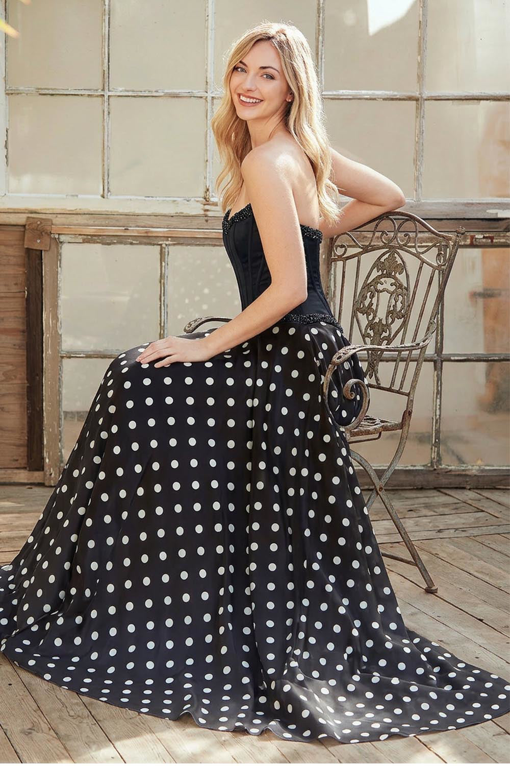 - Design: Strapless sweetheart neckline with crystal embellishment & polka dot A-line skirt