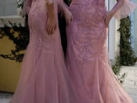Elegance personified in our fit & flare—a divine choice for the mother of the bride. The layered tulle skirt, adorned with delicate lace appliqué, cascades with grace, creating a vision of timeless sophistication. The v-neckline frames the décolletage in a regal embrace, while sheer bell sleeves add a touch of romantic allure. It's more than a gown; it's a celebration of maternal grace and style. With each lace detail and ethereal layer, this dress invites the mother of the bride to step into the spotlight, exuding a quiet confidence and embodying the epitome of timeless beauty at this special occasion.