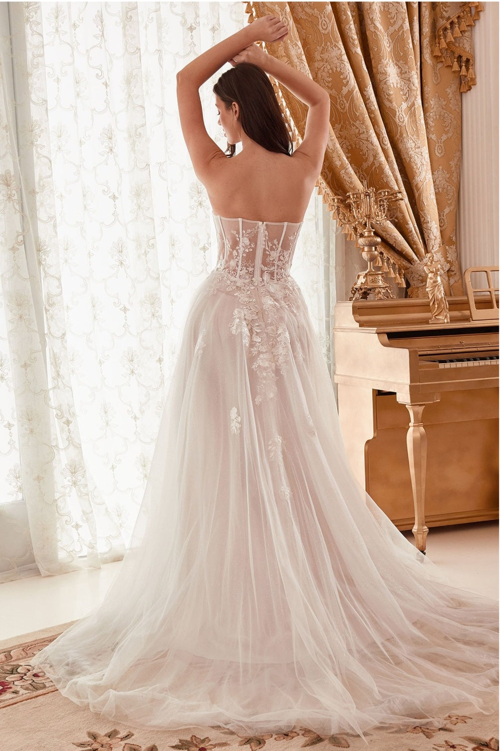 This romantic tulle dress will have you feeling like a princess on your special day. The material and sweetheart neckline showcase femininity, while the sheer boned bodice with lace appliques delicately contours your body for an absolutely stunning look. For added character, a leg slit in the front of the skirt gives you extra flair, and the center back zipper closure ensures that this bridal gown will stay secure all day long. Don’t wait any longer – say yes to this gorgeous strapless floral applique bridal ball gown and make some happy memories!