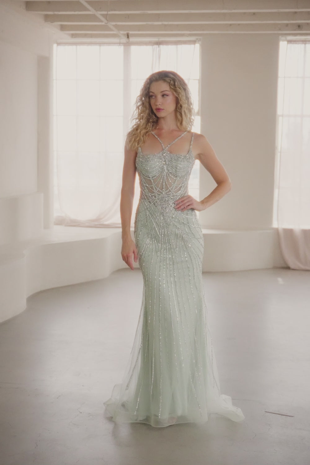 - Design: Sweetheart neckline, thin straps, sheer bodice & linear beaded motif