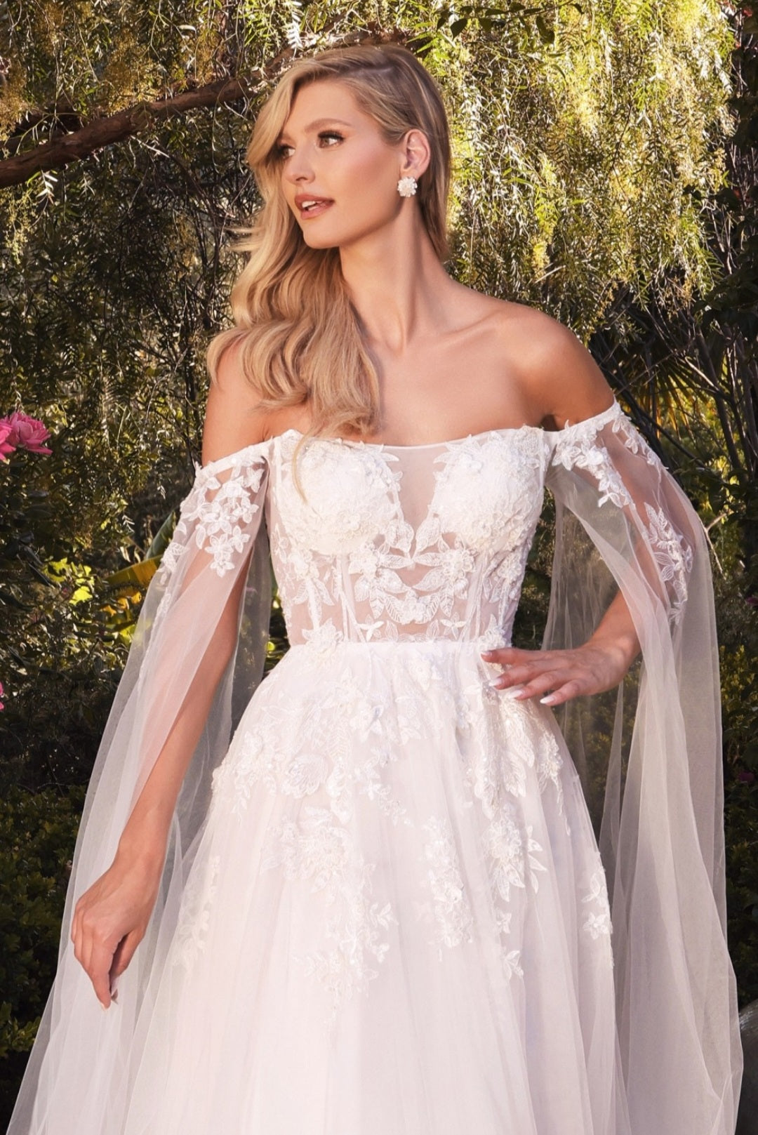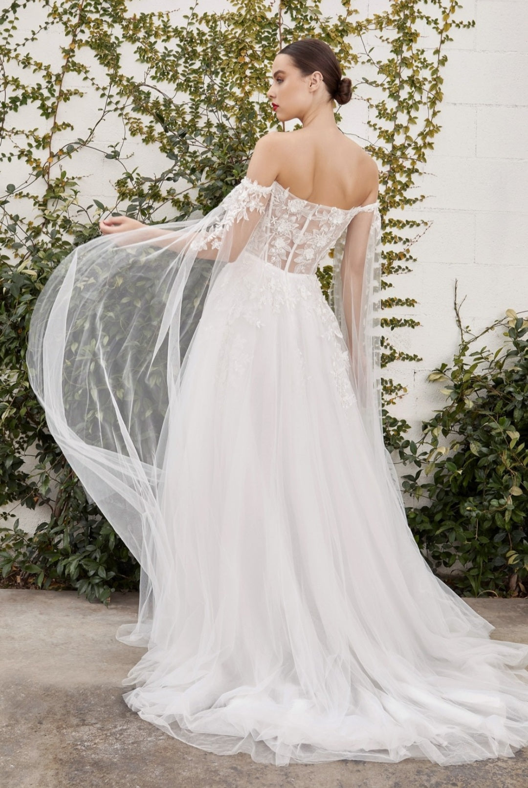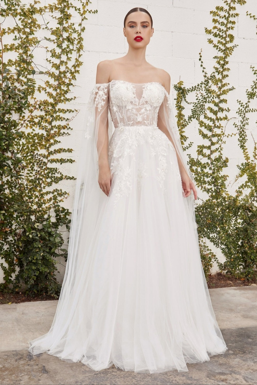 This diaphanous gown features a sheer strapless bodice and frothy A-line skirt cut from layers of soft tulle to a floor-sweeping hem. The bodice has supportive internal boning to ensure it stays in place and is framed by elongated tulle sleeves split along the inseam, falling to meet the hem of the skirt and conjuring up an ethereal mood. Hand cuts degrade lace placements flower about with pearlescent beaded accents. A one-of-a-kind long dress for your once in a lifetime wedding!