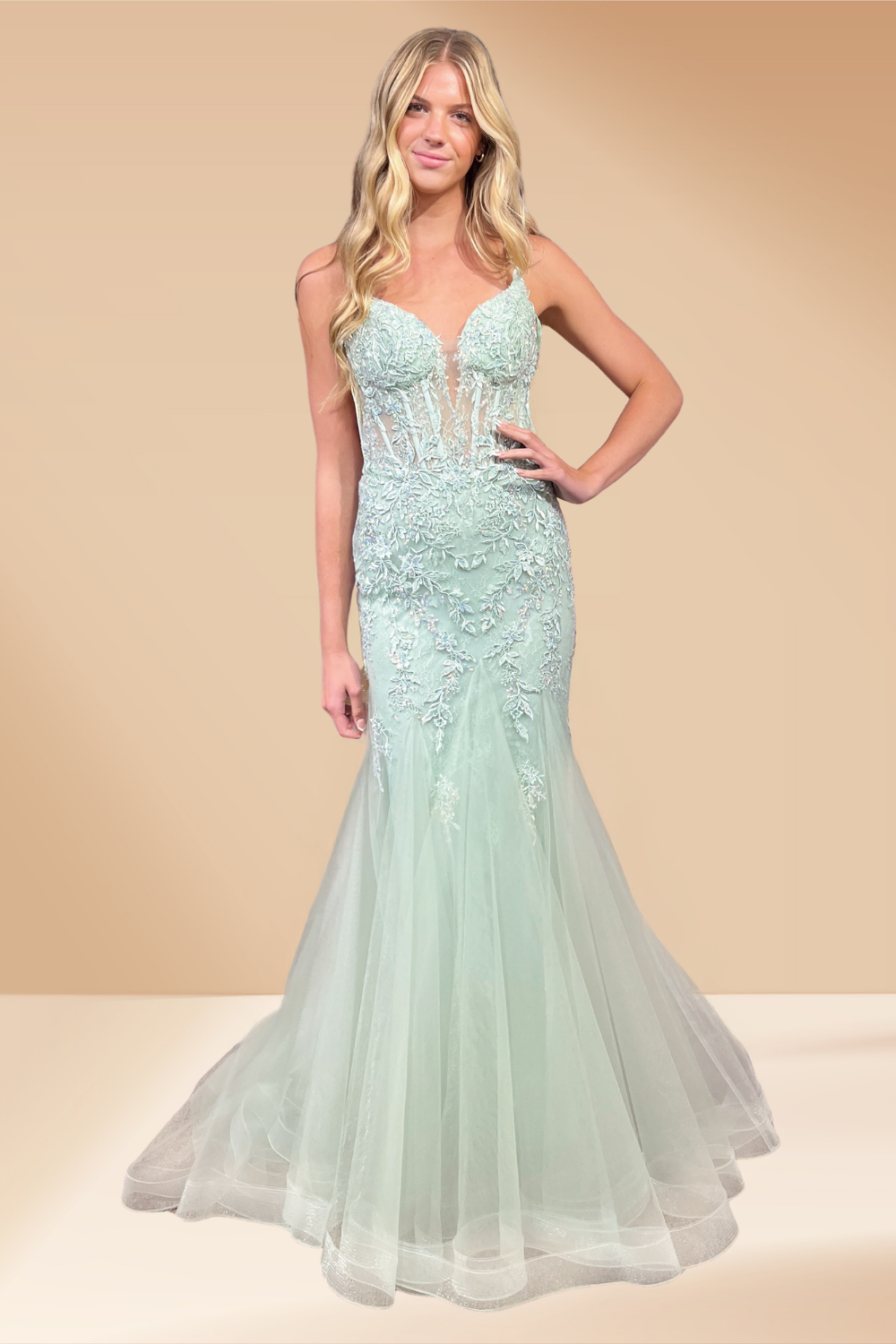 This long formal mermaid dress has a sweetheart neckline with a sheer insert panel, spaghetti straps and features beaded lace applique and tulle. Has an open crisscross open back. This formal dress is definitely a one-of-a-kind long dress for or in any other formal occasions!