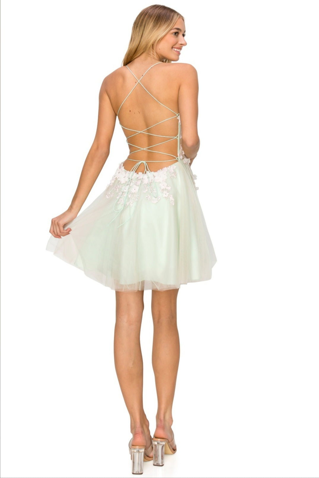 This super cute corset top adorned with 3D floral short dress features a lace-up open back. The dress' gorgeous 3D flower pattern on the bodice and skirt heightens the overall appearance and adds depth. A flirtatious touch and adjustable fit are provided by the short length and lace-up back feature. This dress, which is perfect for homecoming, weddings, and other formal occasions, is made with superior fabrics and expert craftsmanship for comfort and long-lasting design.
