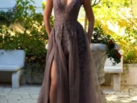 Step into this enchanted iridescent A-line gown and feel like part of a fairytale. This gorgeous, whimsical gown features a plunging neckline, thin straps, and a lace up corset back. The distinctively beautiful lace bodice is embellished with an iridescent shimmer that shines in the light. Get ready for your special occasion in this layered glitter tulle skirt that will keep you dancing the night away. This delightful dress will make you feel like royalty on your special day with a silhouette that any princess in training would be proud to own. Make a statement at prom or special event in our enchanting iridescent A-line gown.