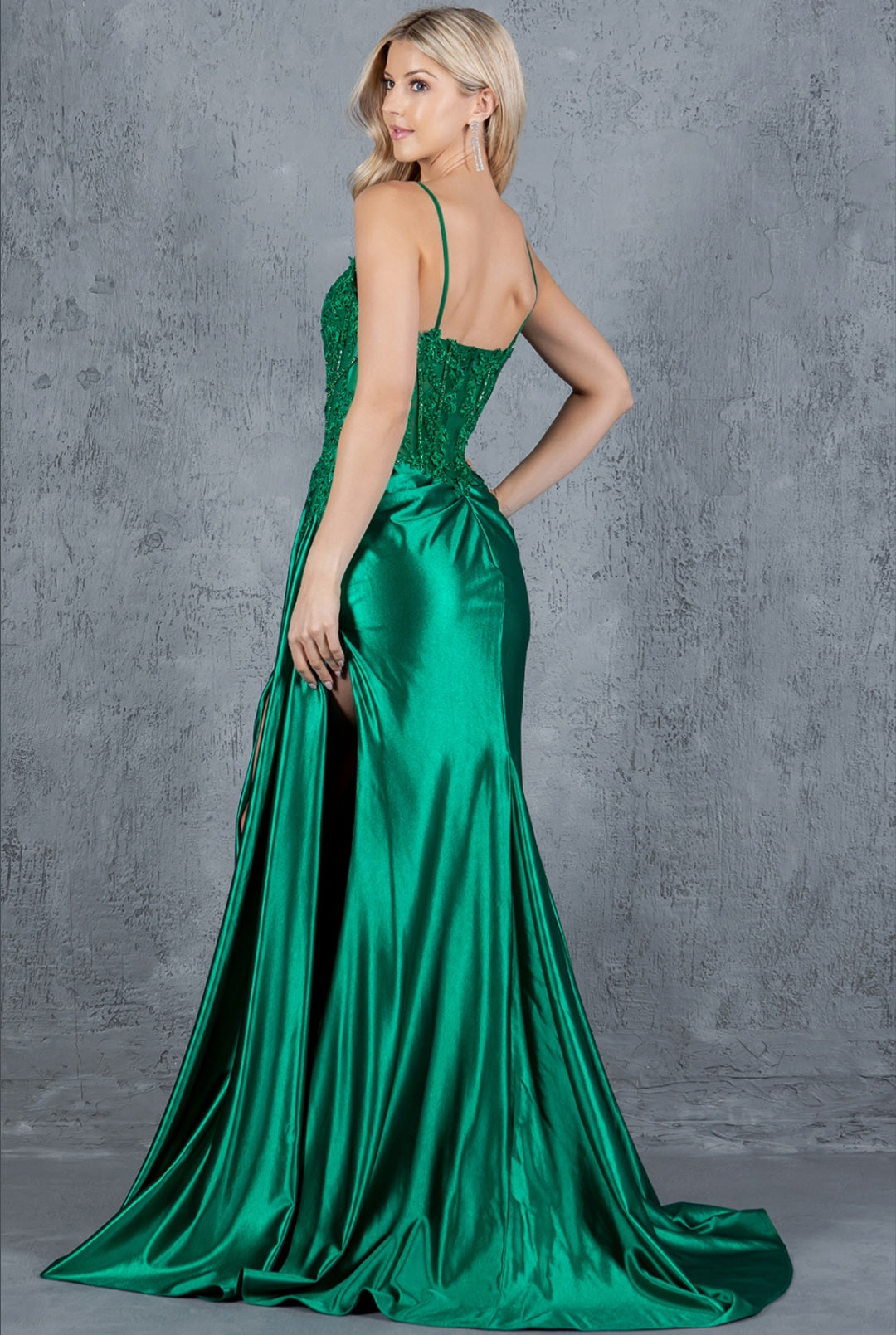A glamorous, romantic gown with a fitted bodice features intricate floral lace embroidery adorned with delicate beads and sequins, creating an elegant and luxurious feel. Thin spaghetti straps provide a soft, delicate touch to the structured bodice, which emphasizes the waist and adds a corset-like appearance. The sweetheart neckline further enhances its romantic appeal, making the gown ideal for formal occasions, such as evening galas or upscale events
