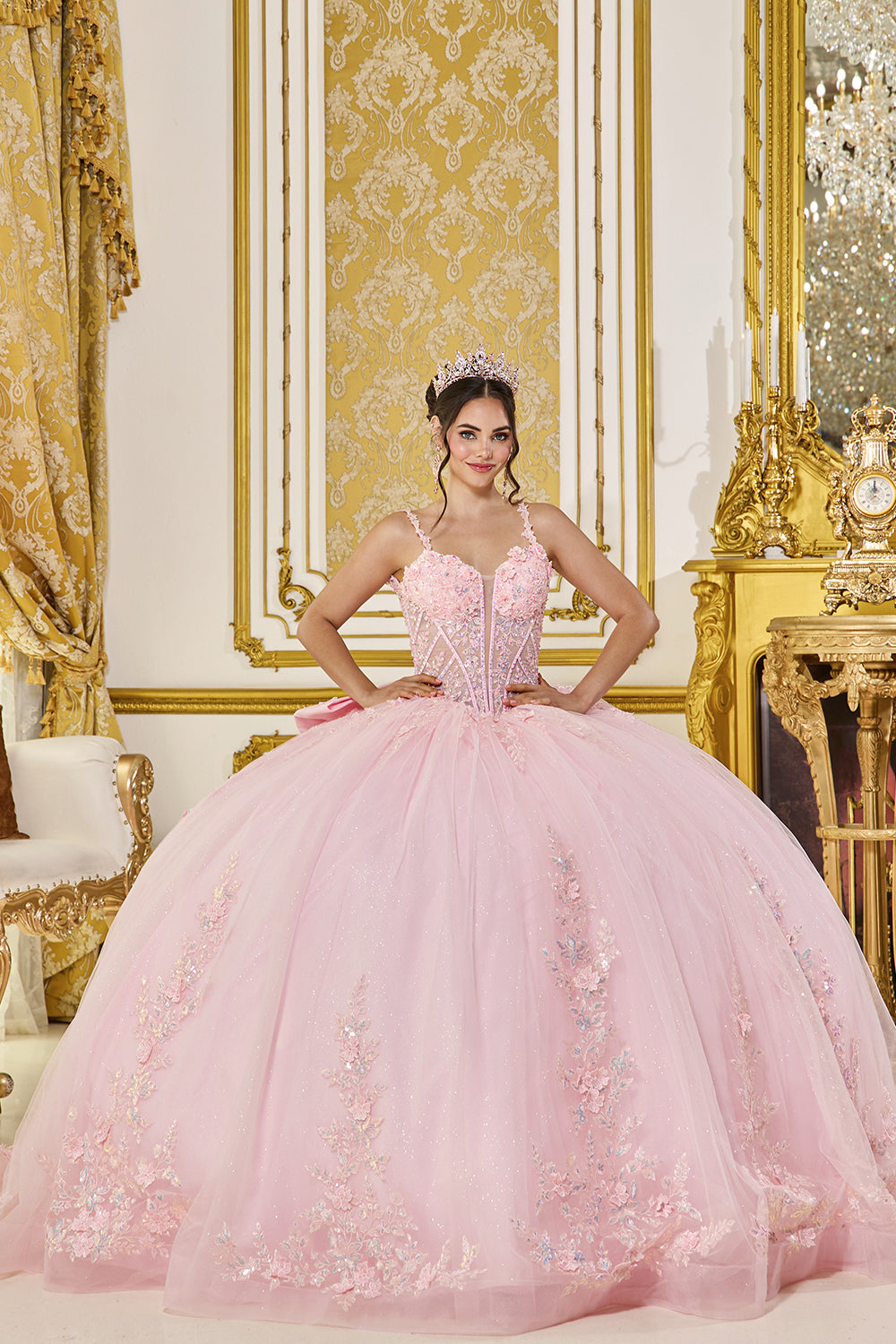 This fairytale Quinceanera gown is with a sheer bodice with shimmering glitter tulle skirt and Delicate Beaded Spaghetti Straps. Delicate floral appliques with iridescent sequins and embroidery. A voluminous bow in soft tulle sits just above the waist, skirt made of layers of shimmering tulle with embroidery appliques that scatter from the bodice to the beautiful, stunning chapel-length train, giving a dress a majestic and dramatic finish, this perfect gown is yours for a graceful, sparkling and unforgettable Quinceanera.