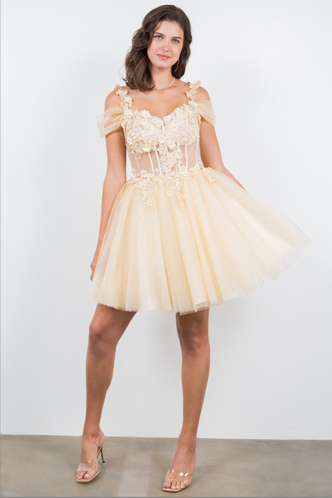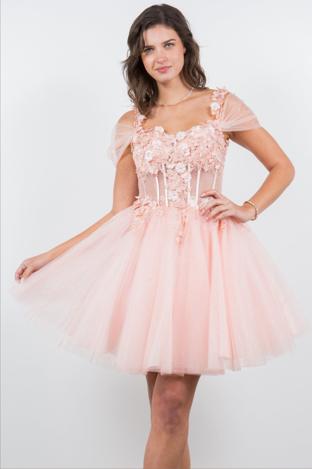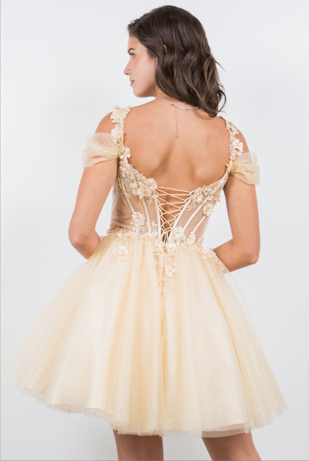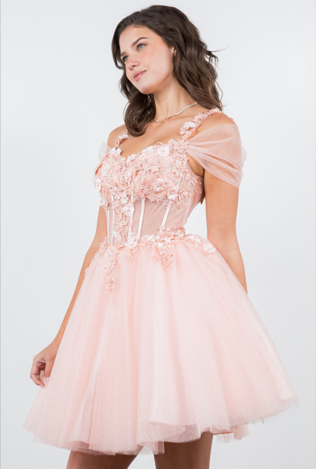 Every princess deserves a beautiful 3D flower dress, and this draped off-the-shoulder A-line short dress hits all the right notes! The fitted bodice is structured to contour and sits perfectly atop an A-line layer of glitter tulle adorned with bead embellishment trickling down from the waistline. It's a sweet, dreamy look that will make everyone ooh and aah at your next event. Soft draping at the shoulders gives this dress an air of romance and regality, and its delicate silhouette flatters every figure. Whether you're attending homecoming or Quinceanera, you'll be sure to turn heads in this enchanting ensemble!