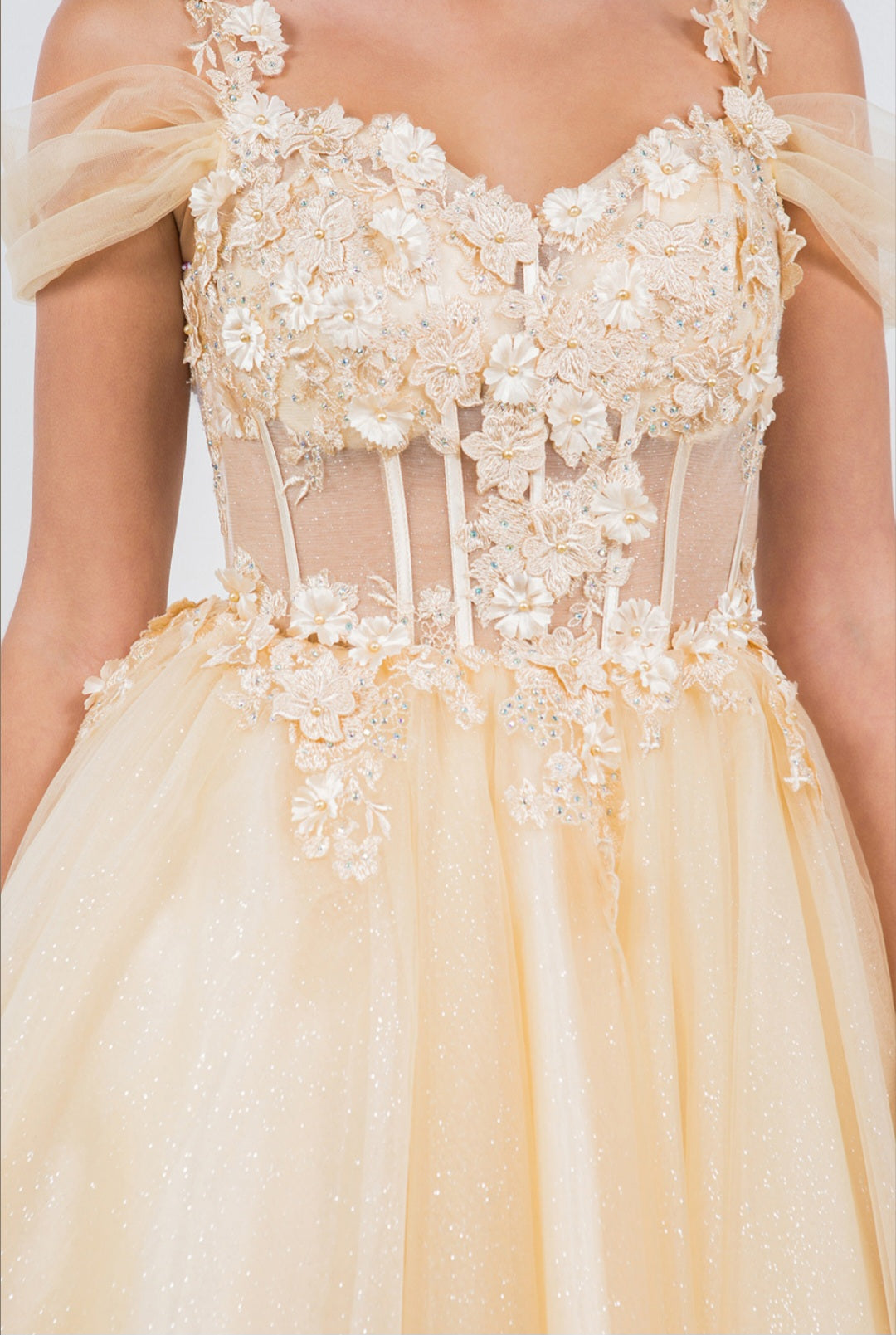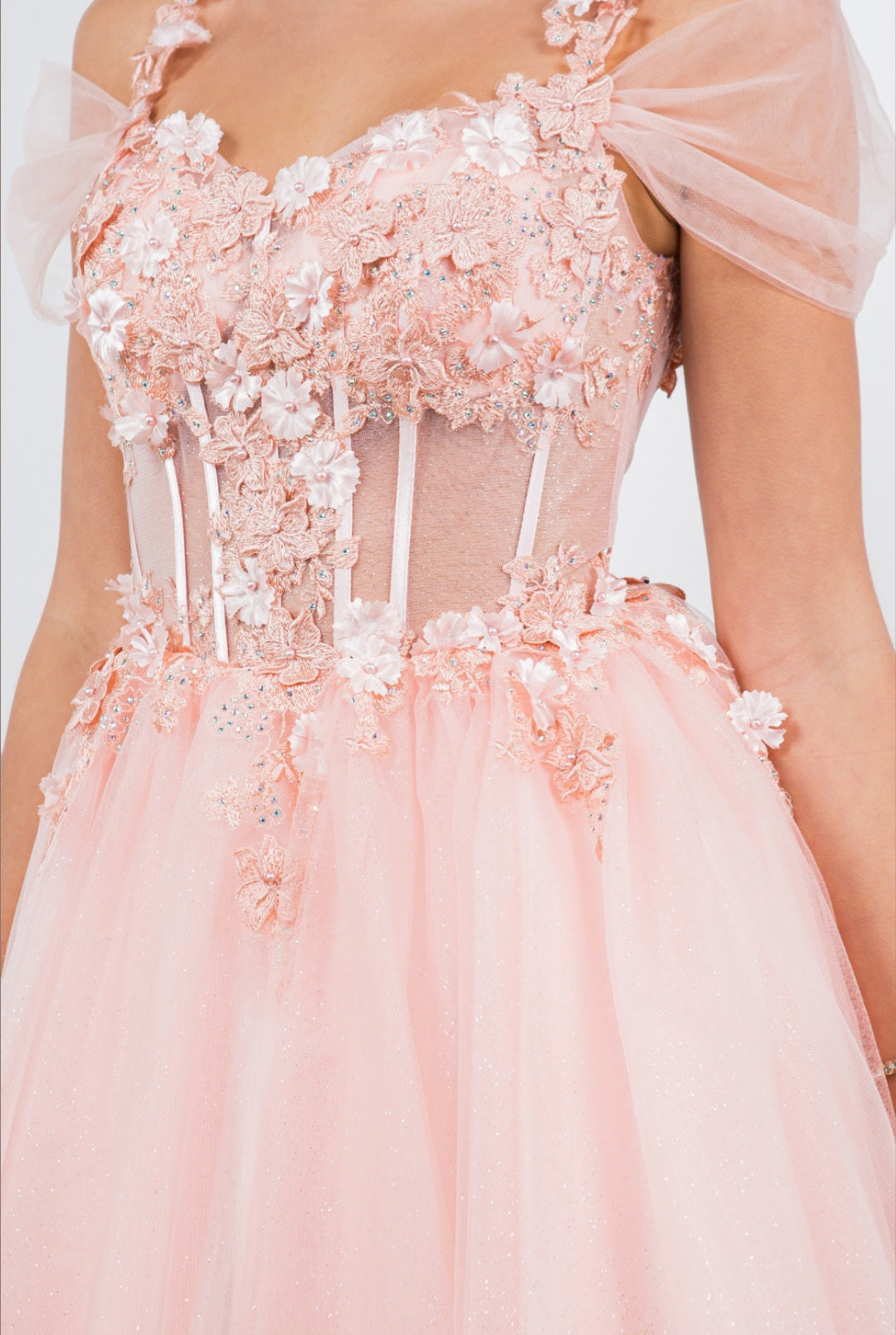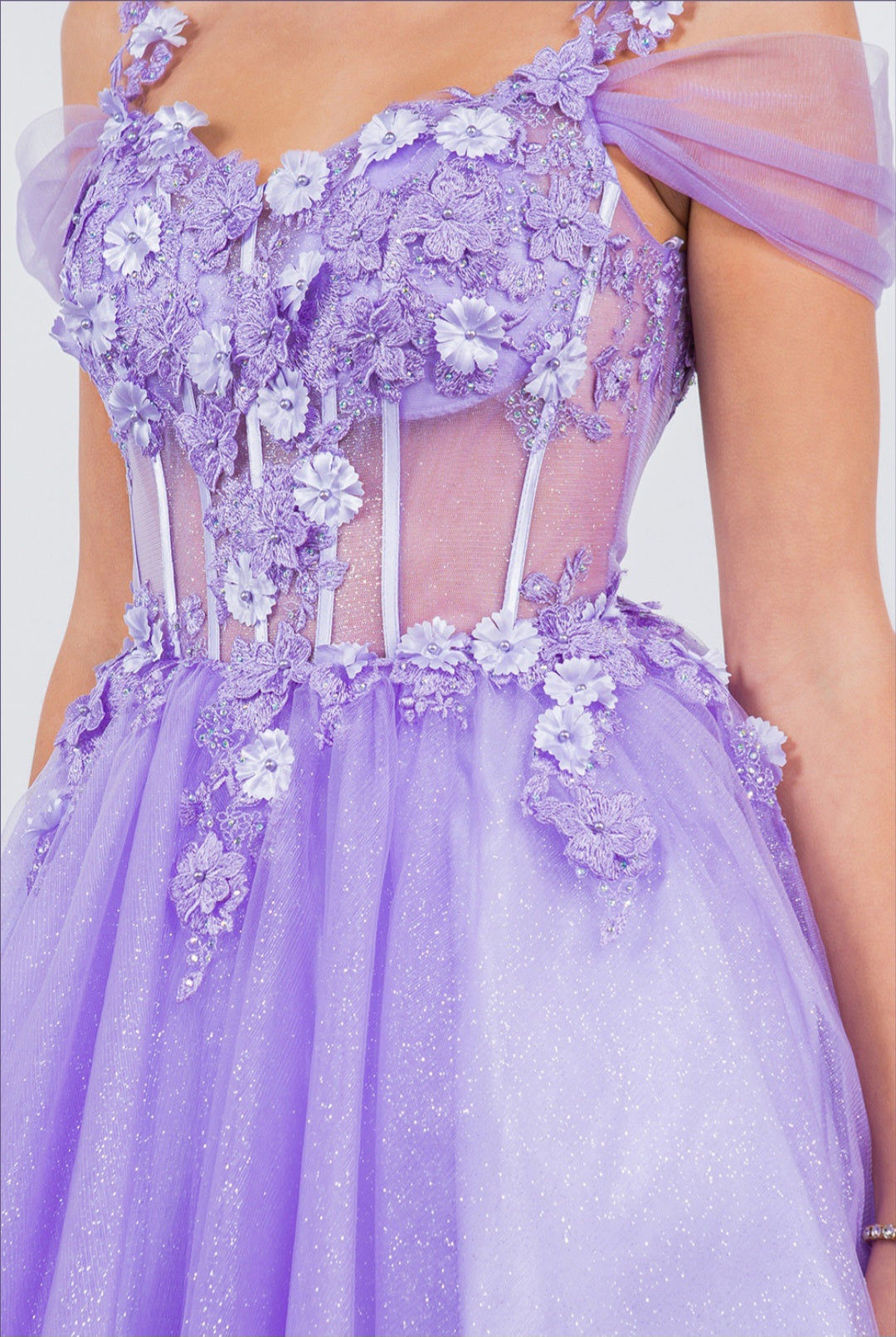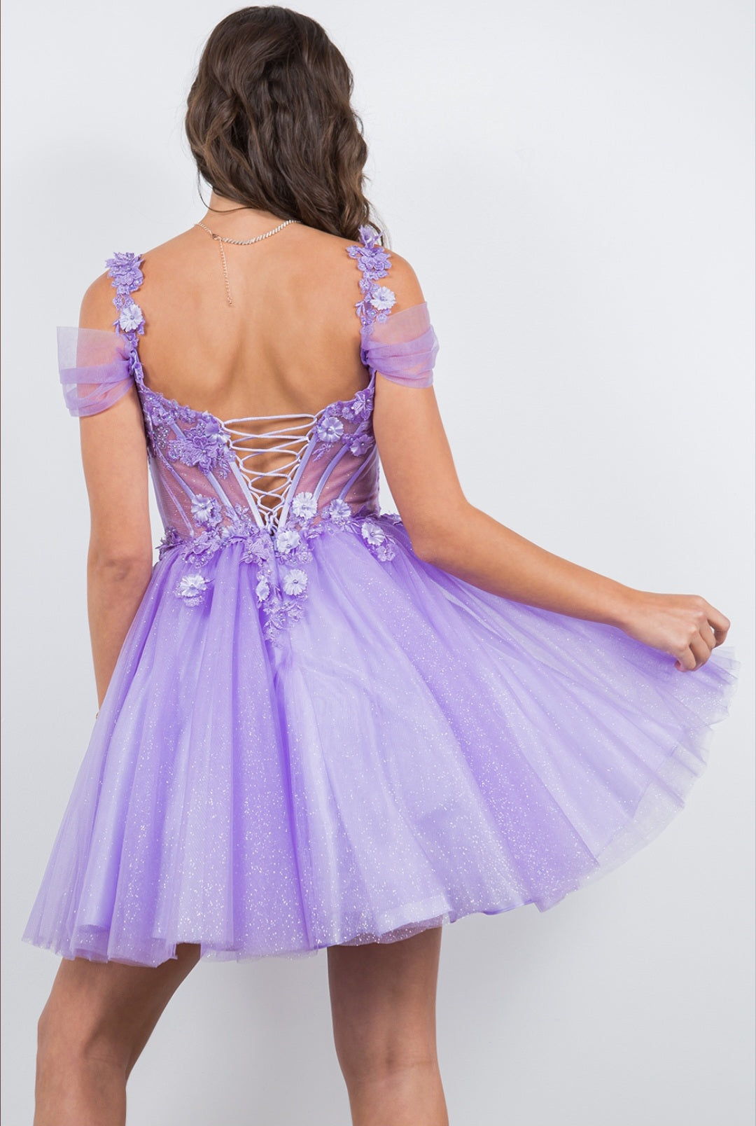 Every princess deserves a beautiful 3D flower dress, and this draped off-the-shoulder A-line short dress hits all the right notes! The fitted bodice is structured to contour and sits perfectly atop an A-line layer of glitter tulle adorned with bead embellishment trickling down from the waistline. It's a sweet, dreamy look that will make everyone ooh and aah at your next event. Soft draping at the shoulders gives this dress an air of romance and regality, and its delicate silhouette flatters every figure. Whether you're attending homecoming or Quinceanera, you'll be sure to turn heads in this enchanting ensemble!