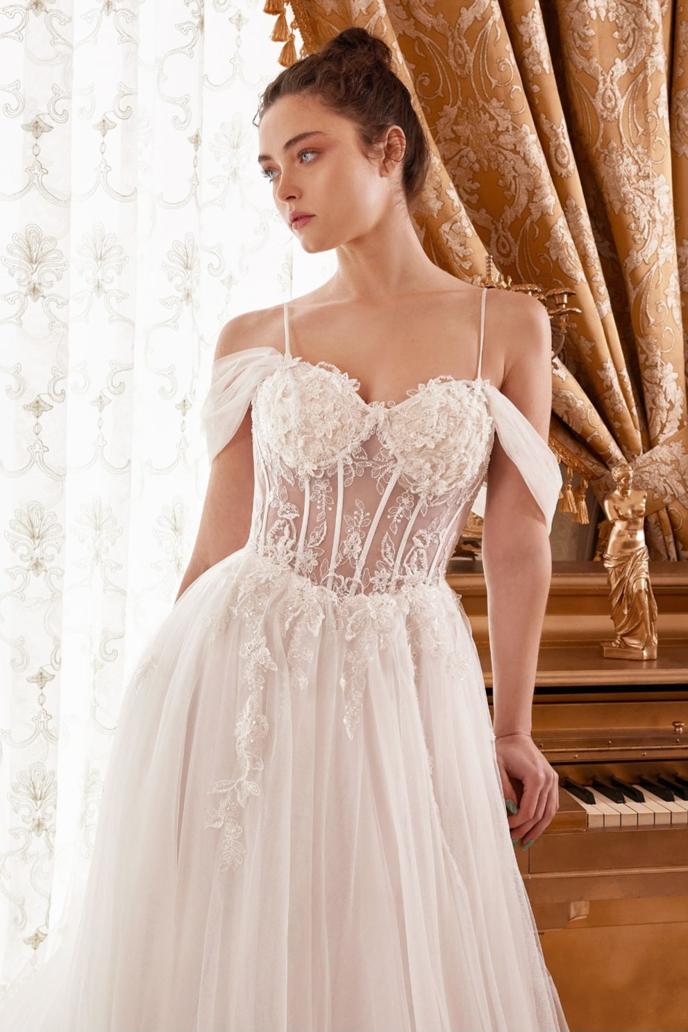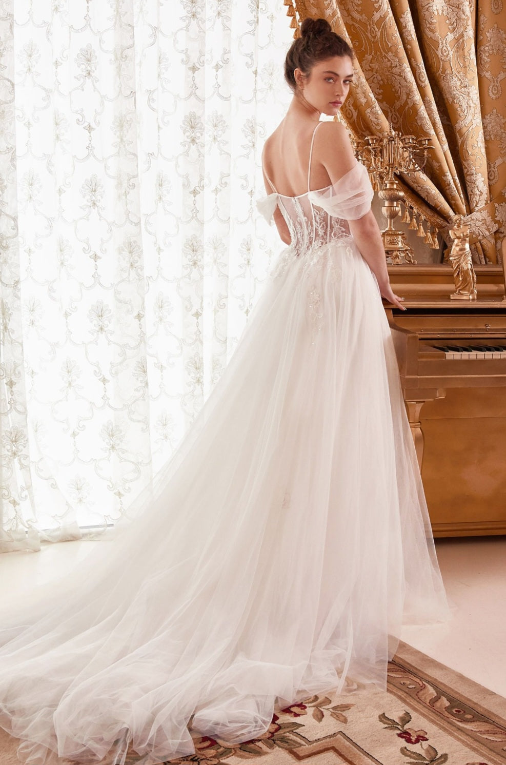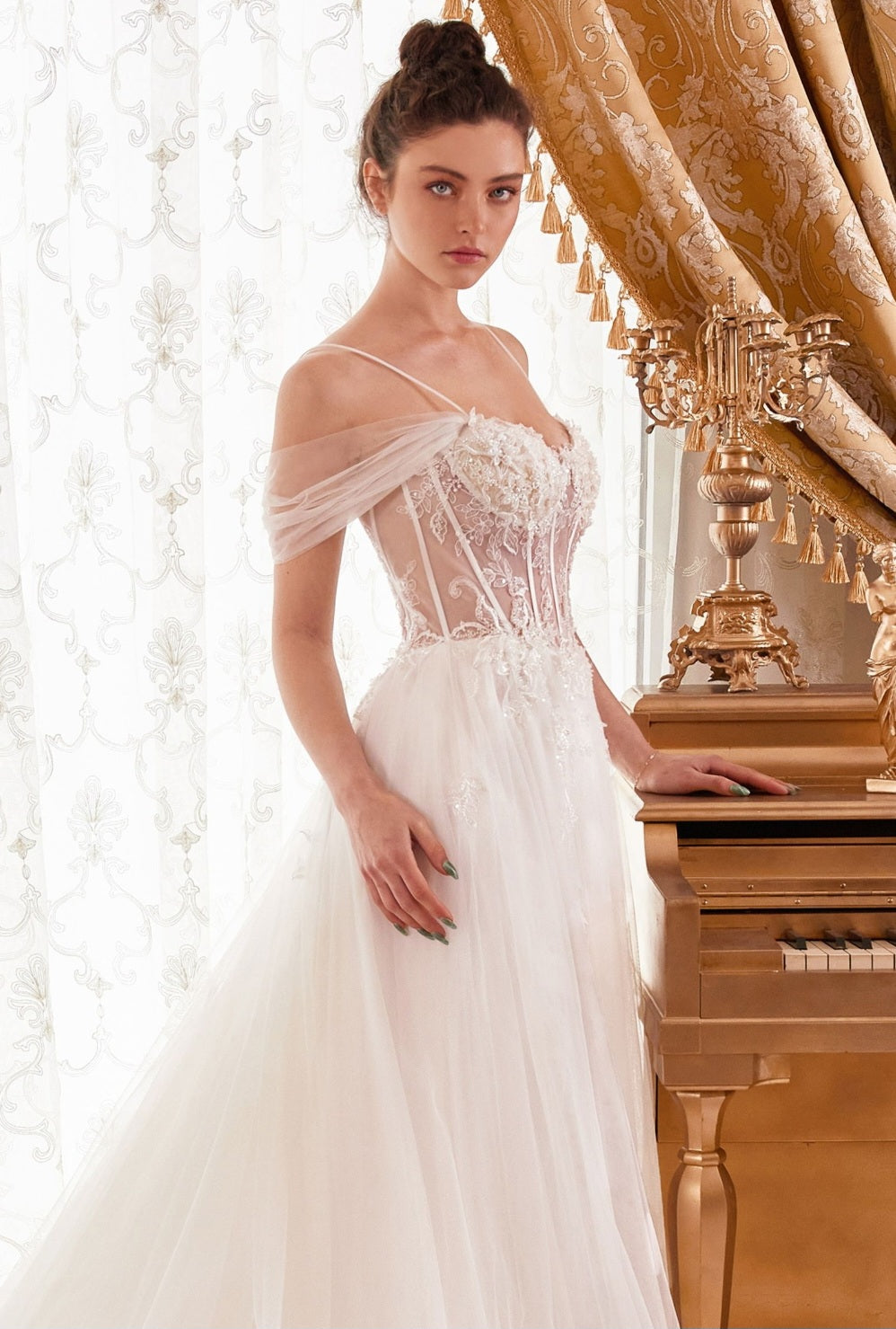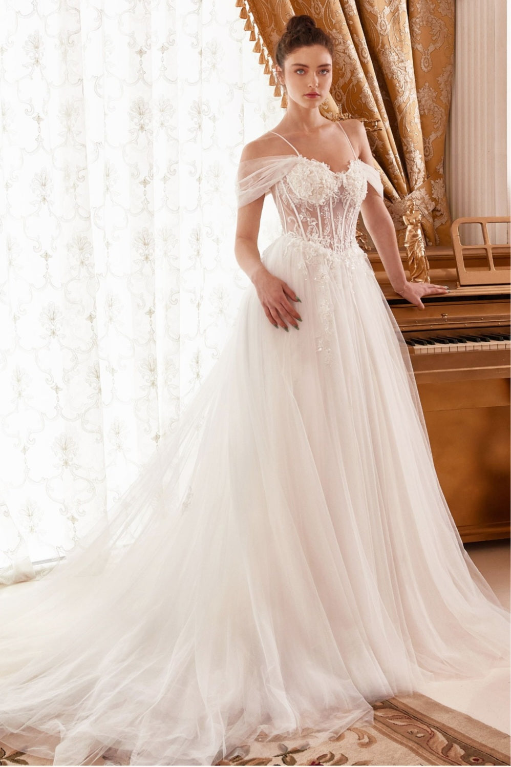 Say "I do" in the most romantic way with this exquisite off white layered tulle ball gown. With an alluring sweetheart neckline and off-the-shoulder draped sleeves, it's the perfect choice for a modern yet timeless look on your big day. Feel like a magical princess when you slip into the sheer boned corset bodice with intricate lace applique and beautiful long layered tulle train - this dress was made for making your fairytale dreams come true! Find yourself becoming truly absorbed in its romantic elegance as you twirl around your dreamy wedding venue. Whether at a garden ceremony or inside a grand hall, this dress will ensure you look every bit like royalty on your special day.