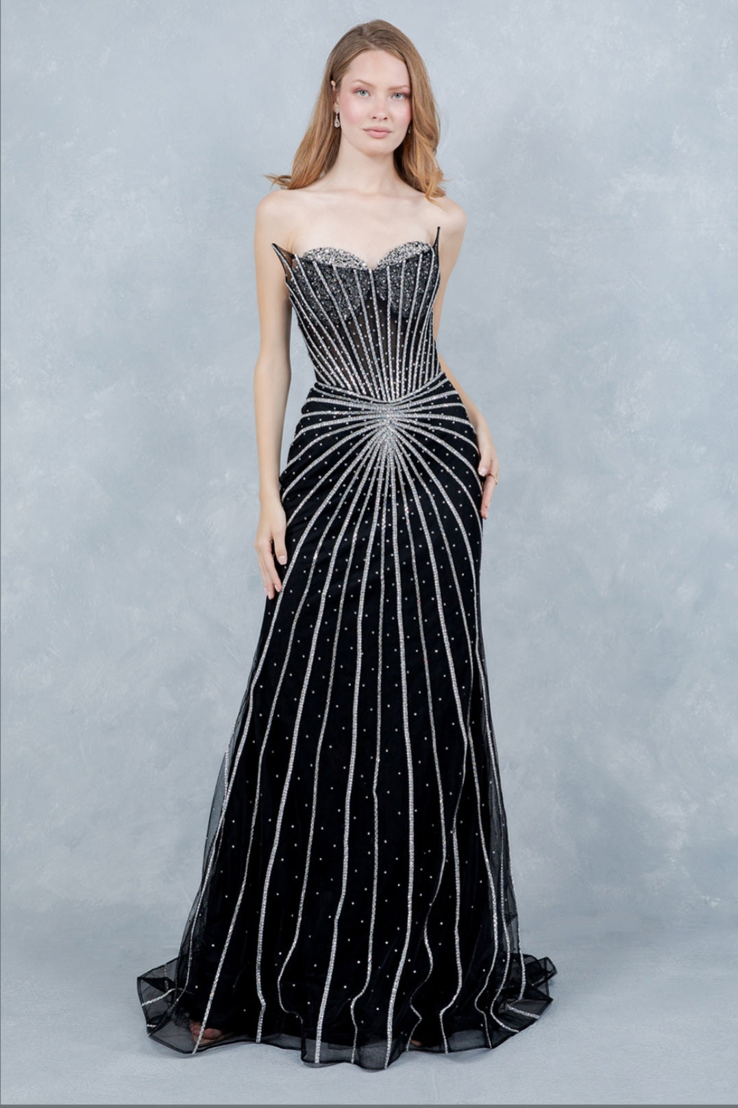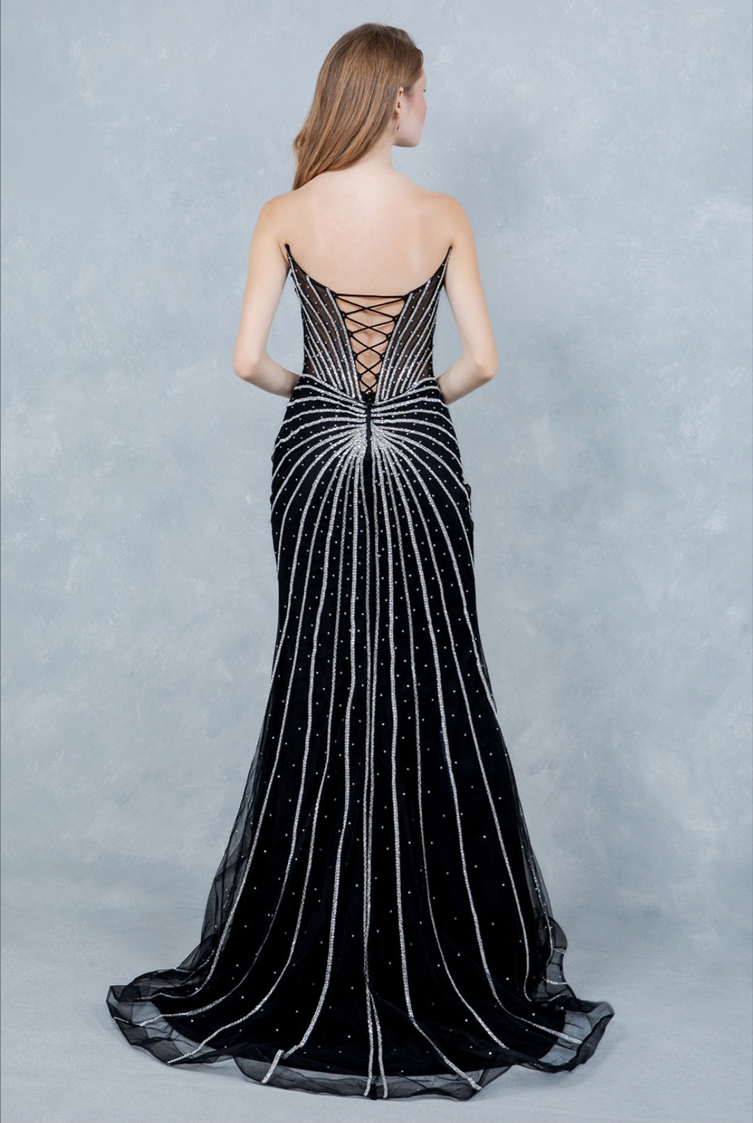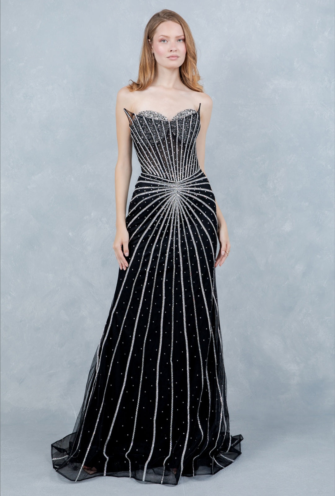 This breathtaking gown is pure red-carpet radiance, sculpted to make a dramatic entrance from every angle. The strapless bodice dazzles with dense crystal embellishments, flowing into sleek, radiant lines that elongate the figure and create a stunning starburst effect at the waist. Sheer paneling adds a touch of allure while maintaining elegant sophistication. The fitted silhouette glides into a graceful mermaid-style skirt, sprinkled with shimmering stones that catch the light with every step. The lace-up back adds a couture touch and ensures a flawless fit. Bold, glamorous, and unforgettable—this gown transforms any moment into a spotlight moment.
