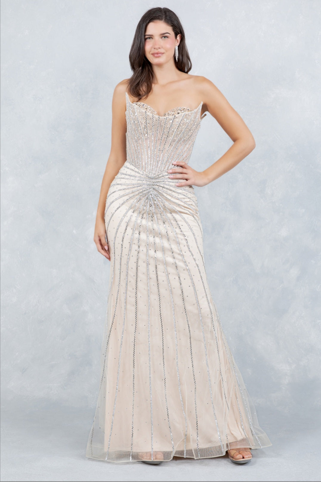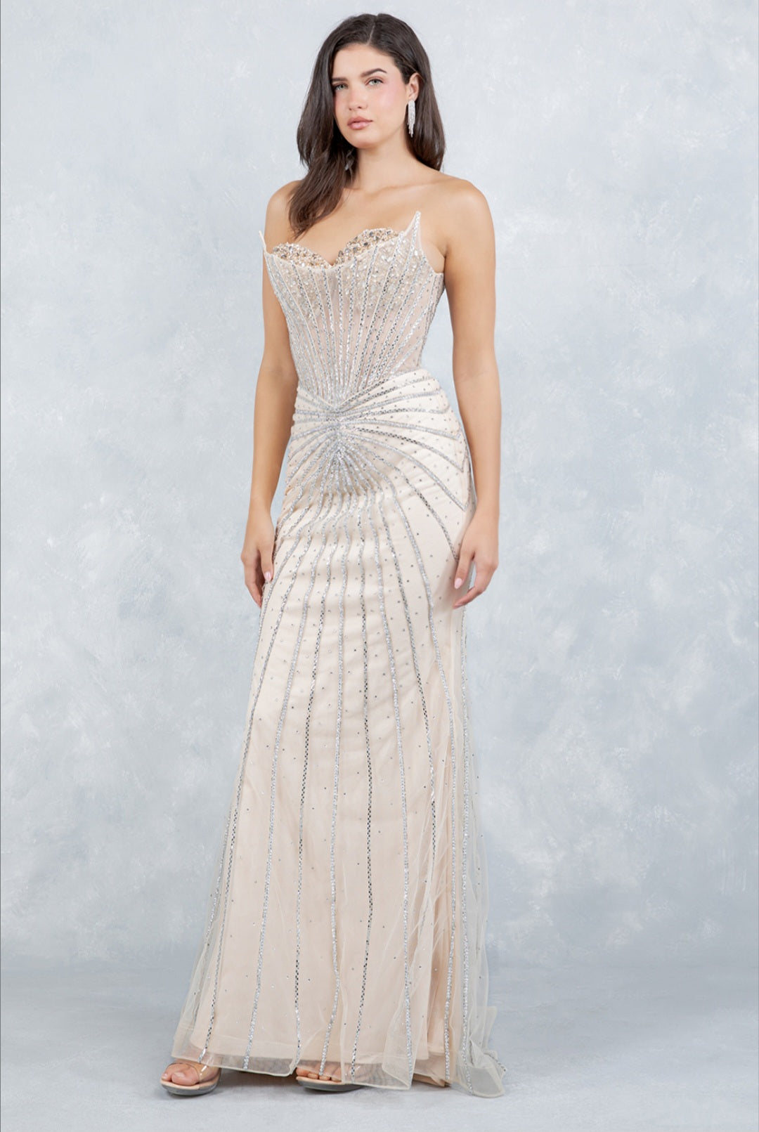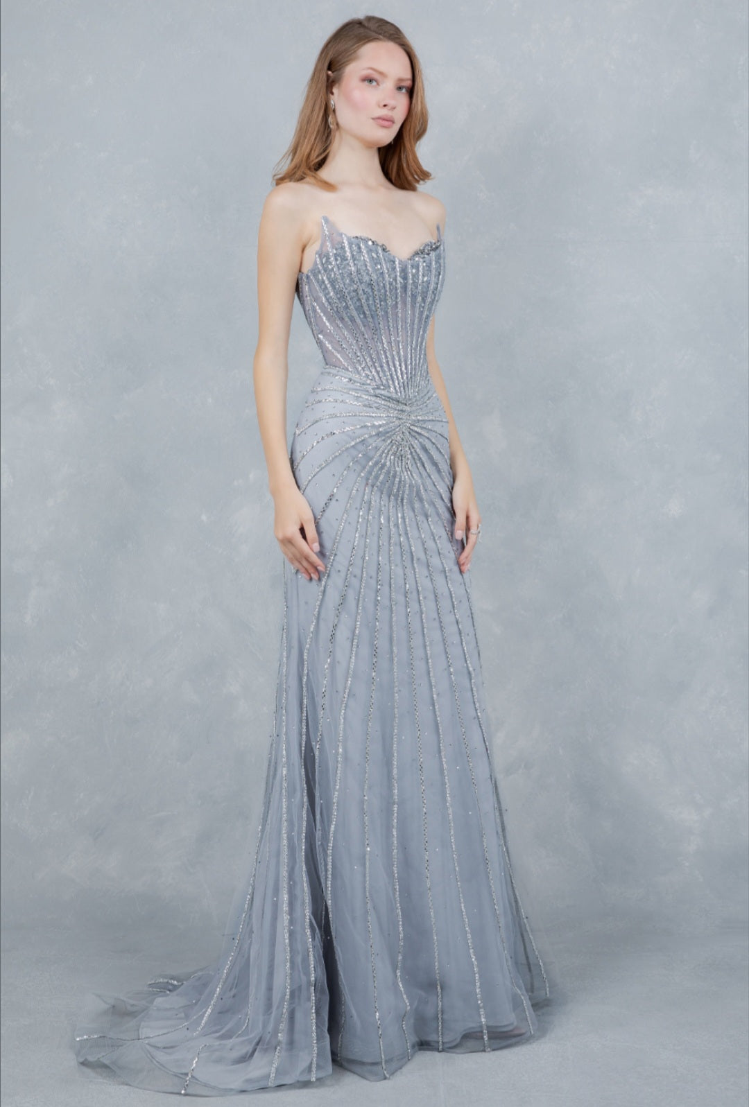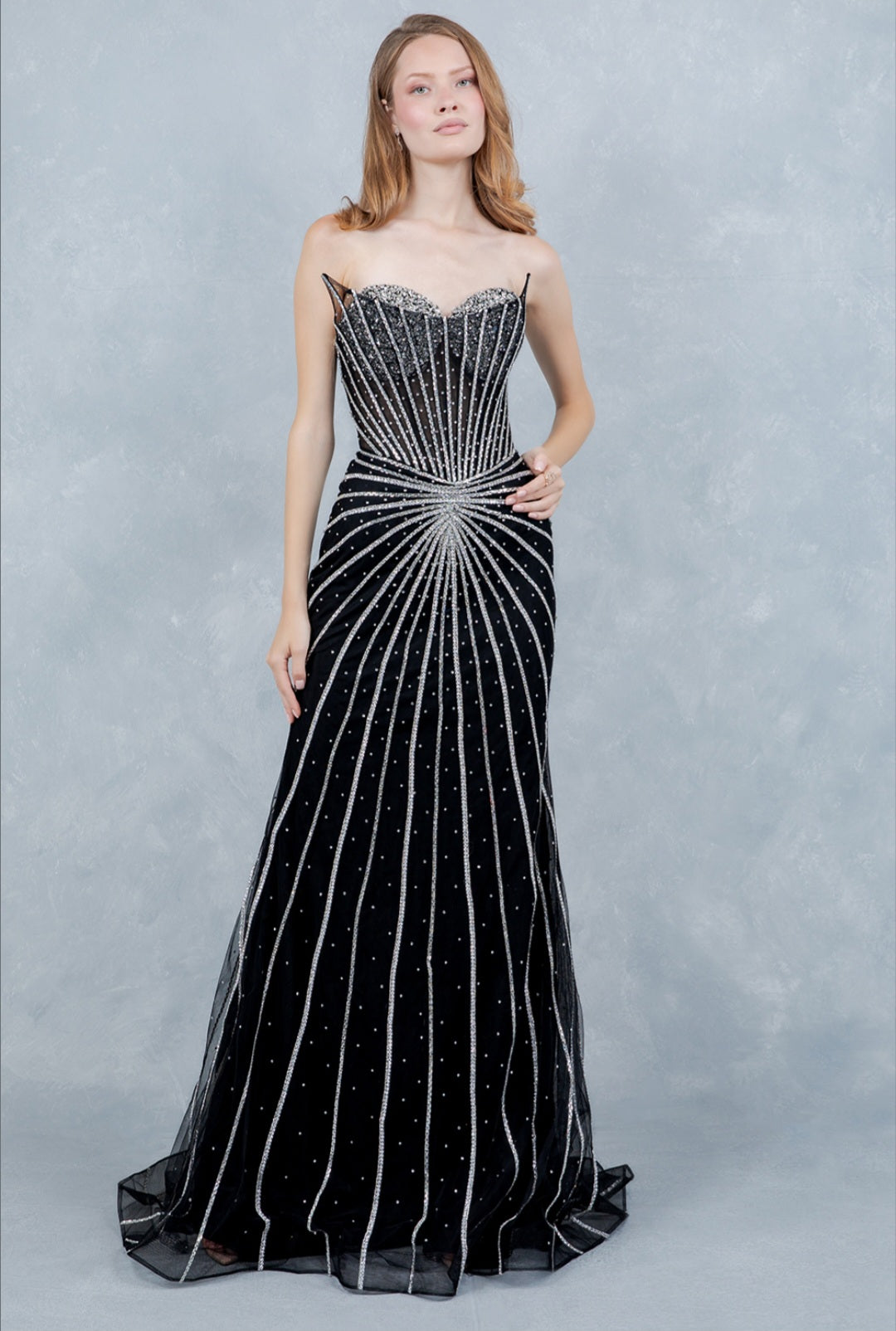 This breathtaking gown is pure red-carpet radiance, sculpted to make a dramatic entrance from every angle. The strapless bodice dazzles with dense crystal embellishments, flowing into sleek, radiant lines that elongate the figure and create a stunning starburst effect at the waist. Sheer paneling adds a touch of allure while maintaining elegant sophistication. The fitted silhouette glides into a graceful mermaid-style skirt, sprinkled with shimmering stones that catch the light with every step. The lace-up back adds a couture touch and ensures a flawless fit. Bold, glamorous, and unforgettable—this gown transforms any moment into a spotlight moment.