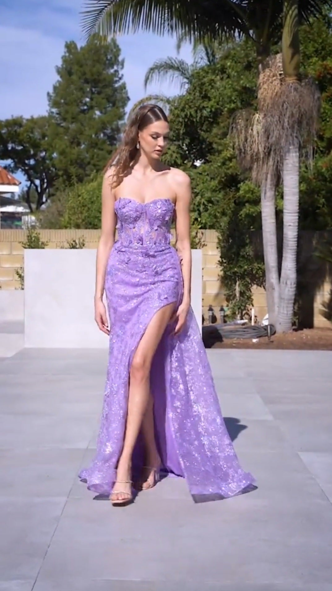 This long formal dress is strapless with a sweetheart neckline and features a corset boned bodice, 3D butterflies' applique and an open side slit.  An ideal full-length dress for red carpet events, pageant, prom or in any other formal occasions!