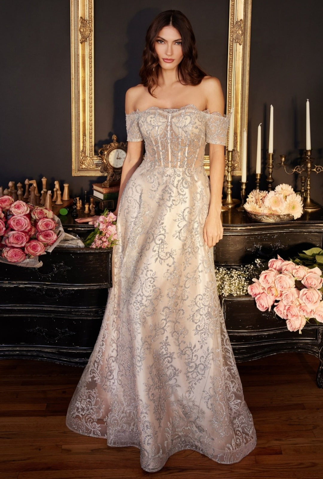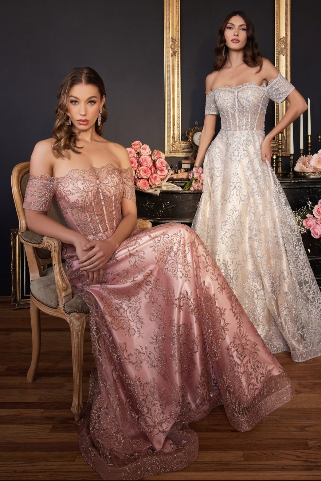 This long off the shoulder strap formal dress has a semi-sweetheart neckline and features a sheer corset boned bodice.  An ideal full-length dress for red carpet events, pageant, prom or in any other formal occasions!
