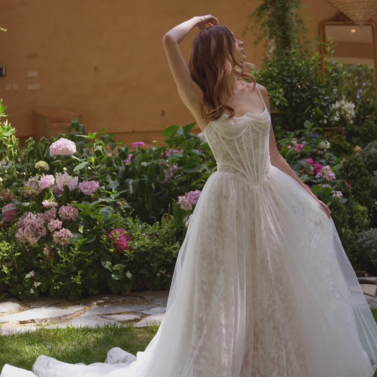 This romantic A-line wedding gown is crafted with delicate lace and sheer tulle, creating a soft, graceful silhouette that feels both modern and timeless. The structured corset bodice features exposed boning and a scoop neckline with pearl-detailed straps, adding a refined yet ethereal touch. The flowing skirt is layered with floral lace and finished with a dramatic chapel train, making this gown an effortlessly elegant choice for garden ceremonies or outdoor "I do's."