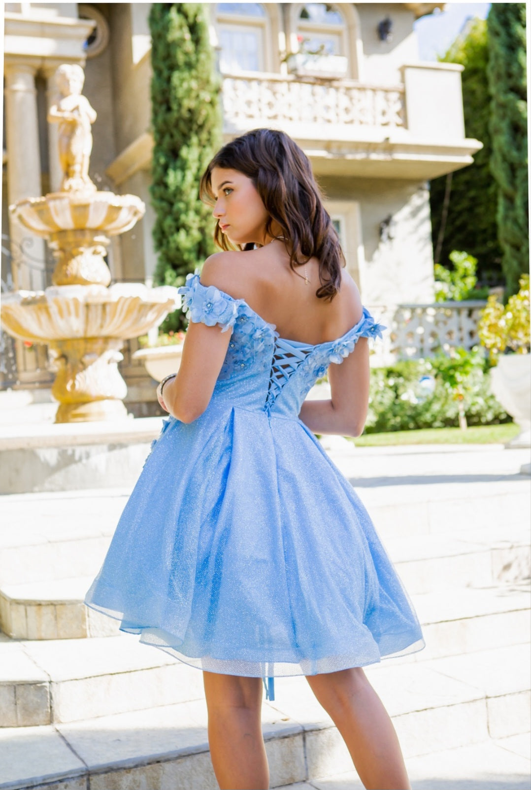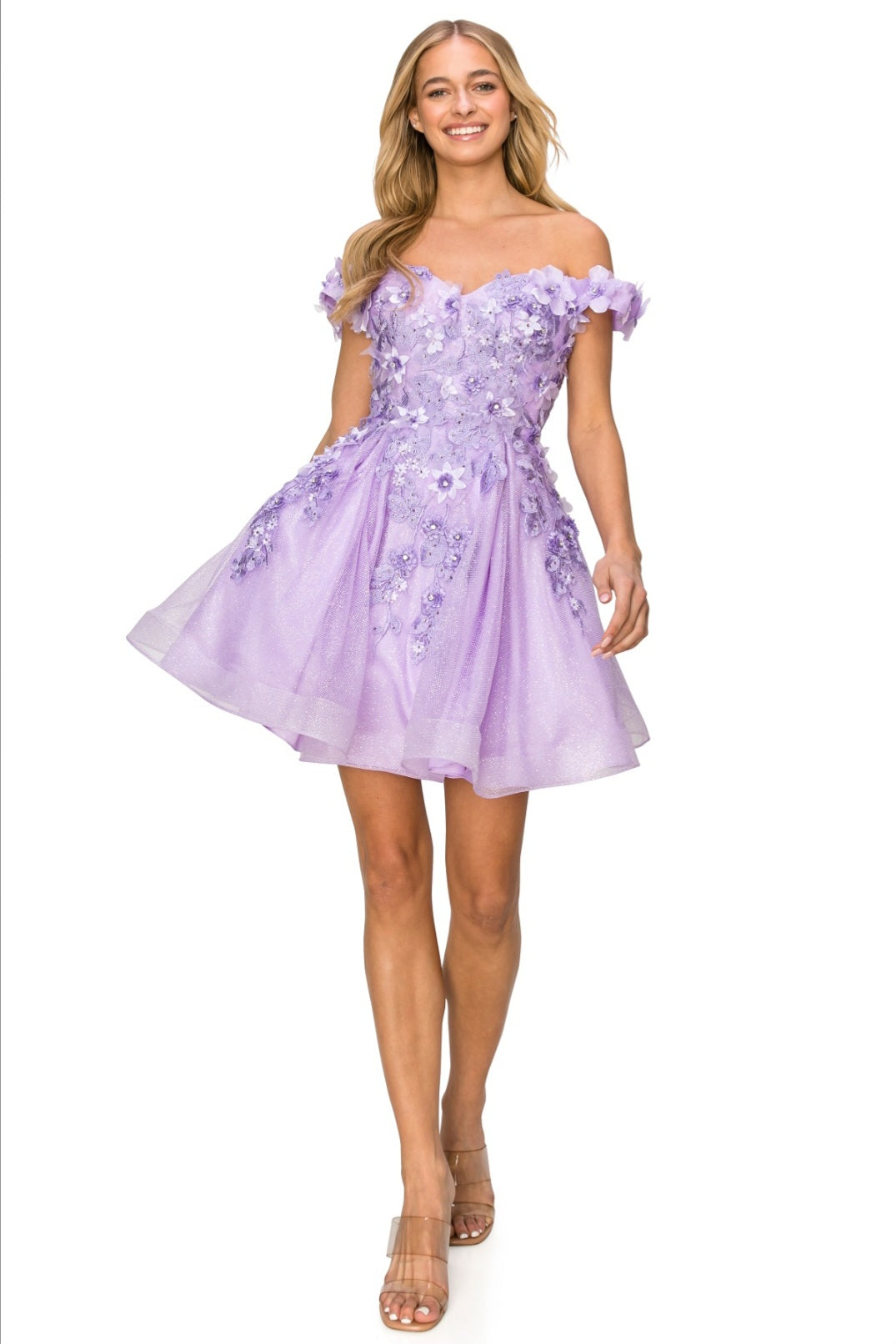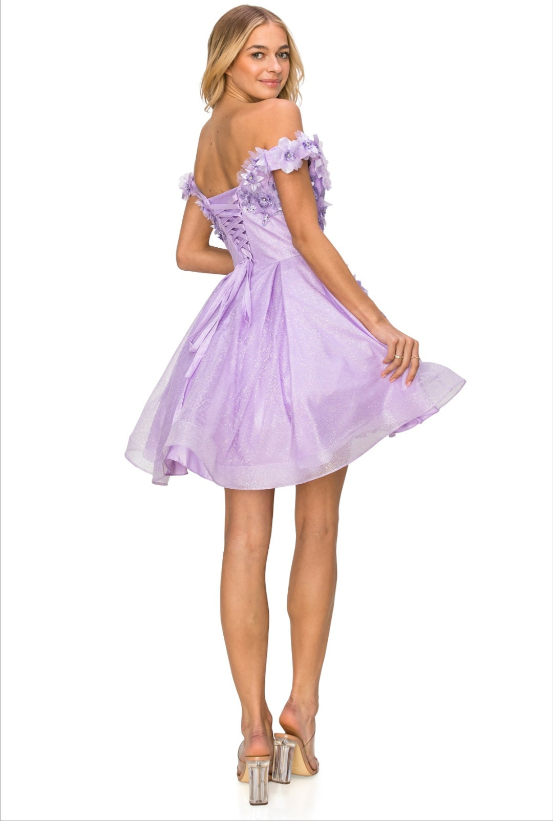 Make the night special in this beautiful 3D flower glitter off shoulder short dress in which features an off the shoulder 3D flower detail bodice and glitter tulle skirt. Tapered bottom for maximin flare and corset back for easy entrance and better fitting. A great dress homecoming, or any special occasion!