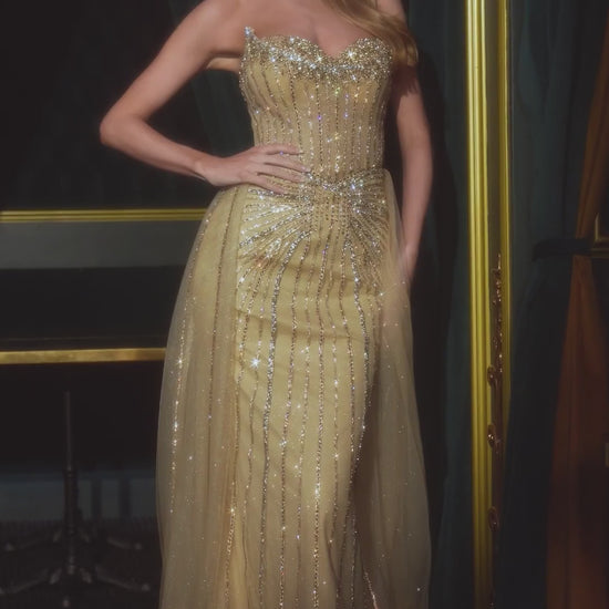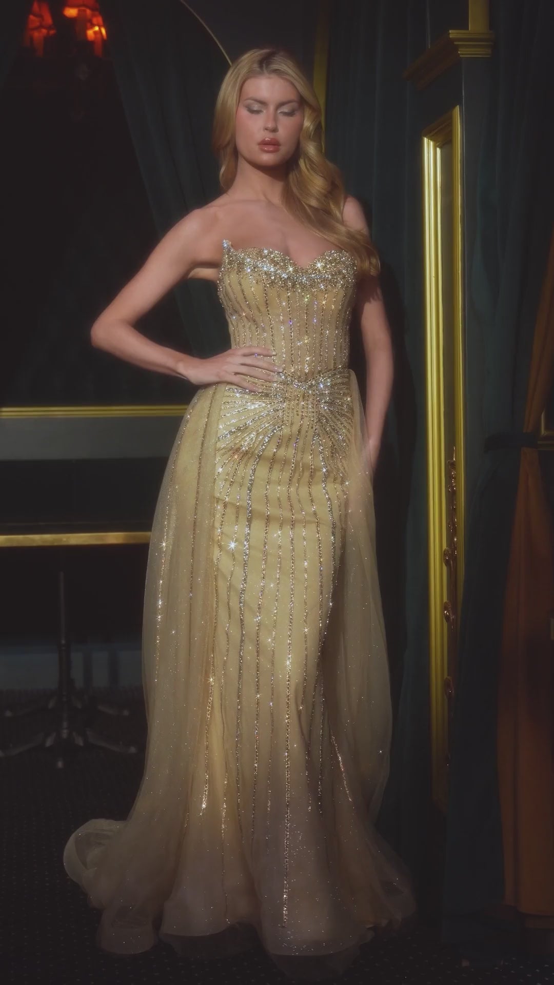 This strapless fitted gown dazzles with linear crystal beading that adds a modern touch of elegance. The structured bodice ensures support and comfort, while the layered tulle overskirt creates a dramatic yet graceful silhouette. Perfect for prom, black tie events, or red-carpet premieres, this dress embodies sophistication and glamour.