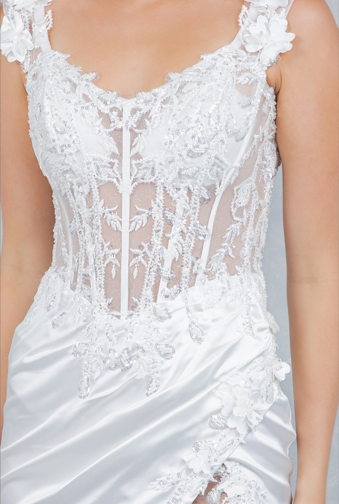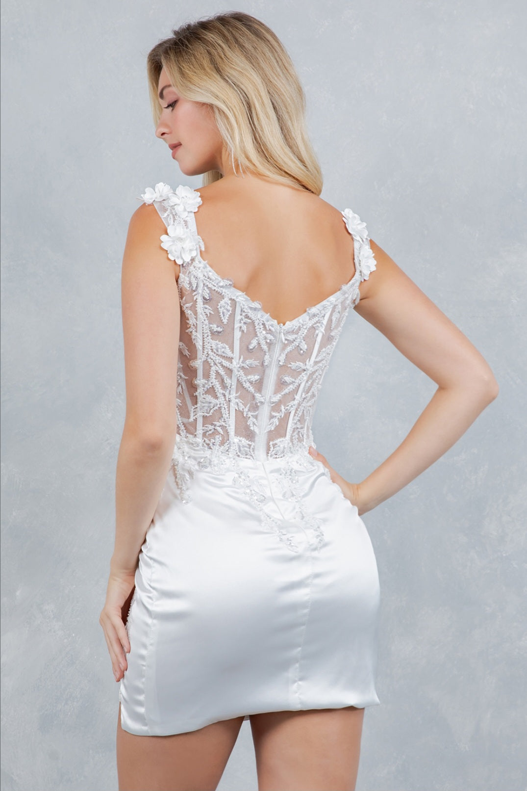 This beautiful floral off the shoulder mini dress is the perfect number for your next special event. This gorgeous dress features an off the shoulder lace adorned sheer bodice and intricate floral appliques, radiating femininity and subtle elegance. The gathered soft satin skirt is finished with a slit for added allure, embellished with detailed flowers and beading that add to its sophisticated style. Whether it's homecoming or a wedding, you will be sure to exude romance in this statement piece.