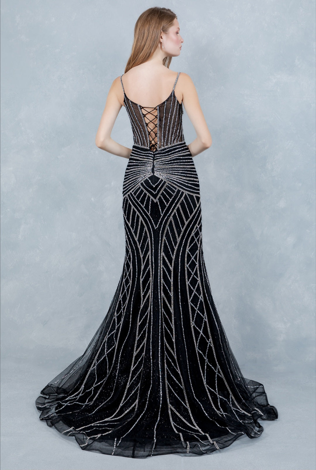 This breathtaking gown radiates luxury with its dazzling, art-deco–inspired beadwork. Intricately placed silver rhinestones create dramatic geometric patterns that elongate the silhouette and shimmer from every angle. The sheer corset bodice features sculpted lines and delicate straps, adding a modern, high-fashion touch while providing a flattering, structured shape. A lace-up back enhances the fit and adds elegant detail. The skirt flows into a graceful mermaid-style flare, finished with a soft tulle hem that moves beautifully with each step. Sophisticated, bold, and unforgettable—this gown is perfect for prom, galas, or red-carpet moments where you want maximum impact.