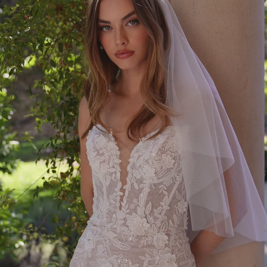 Crafted for the modern romantic, this bridal gown showcases a captivating fit-and-flare silhouette designed to enhance and flatter the figure. The strapless sweetheart neckline is framed by a sheer structured bodice adorned with floral appliqué that cascades gracefully down the hips. Layers of soft tulle create a whimsical, tiered skirt with dramatic flair, ideal for making a memorable entrance on your special day.