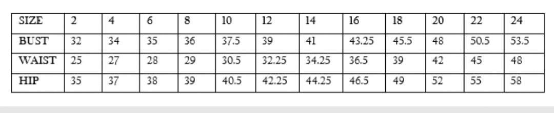 To ensure the perfect fit make sure you choose a larger size if you are in between two sizes. Also keep in mind that the dress may not be an exact fit and therefore may need alterations by your local tailor*