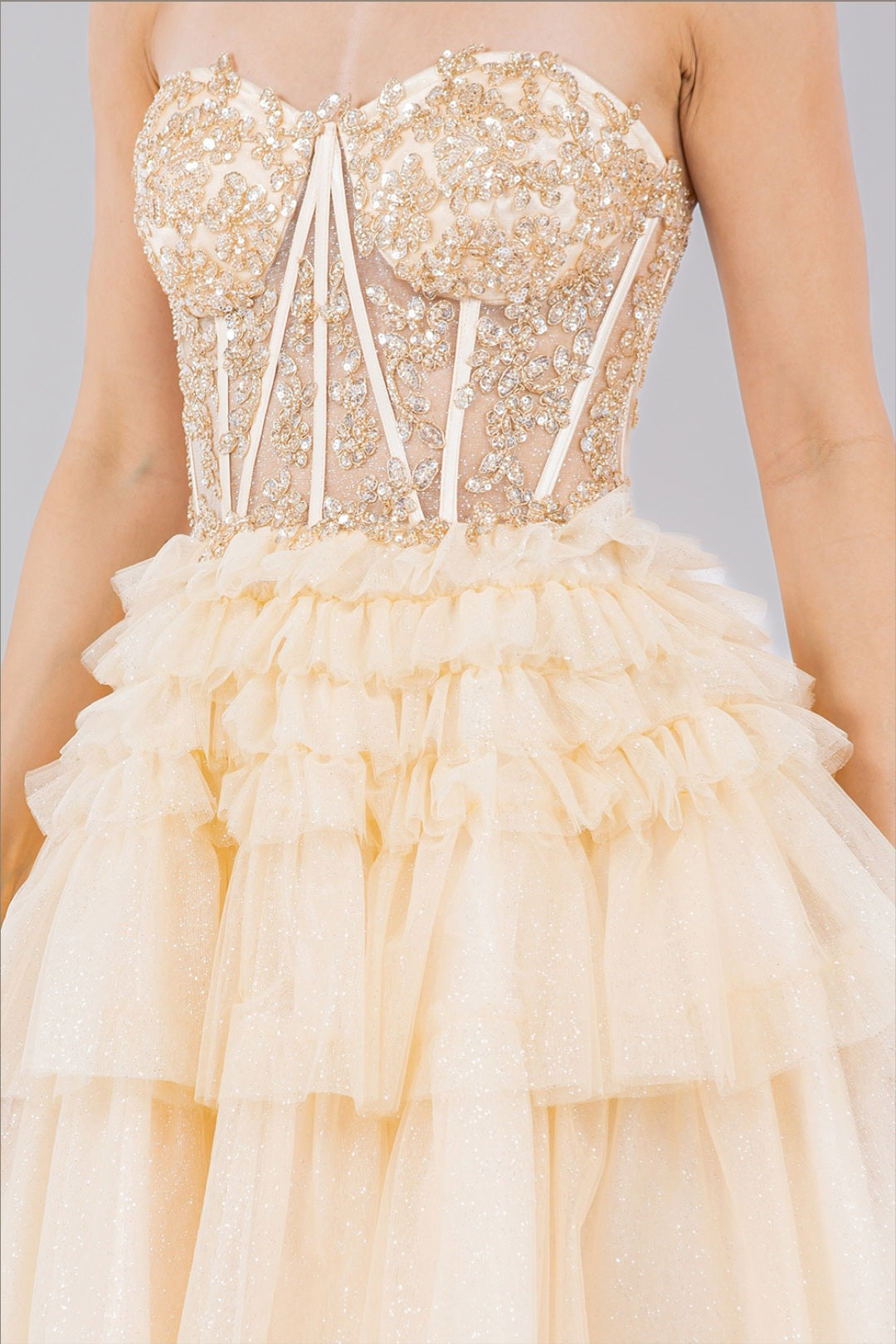 - Beaded bodice, spaghetti strap corset style sweetheart neckline