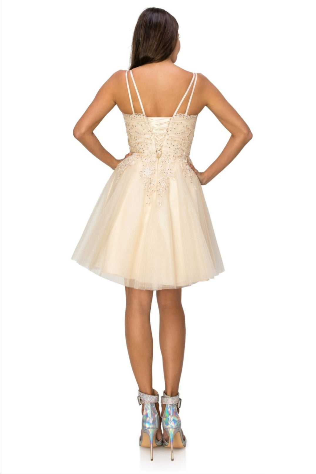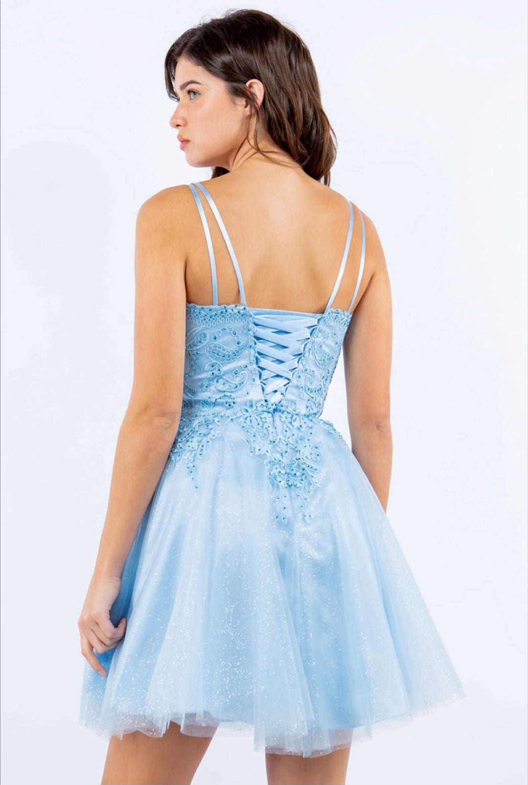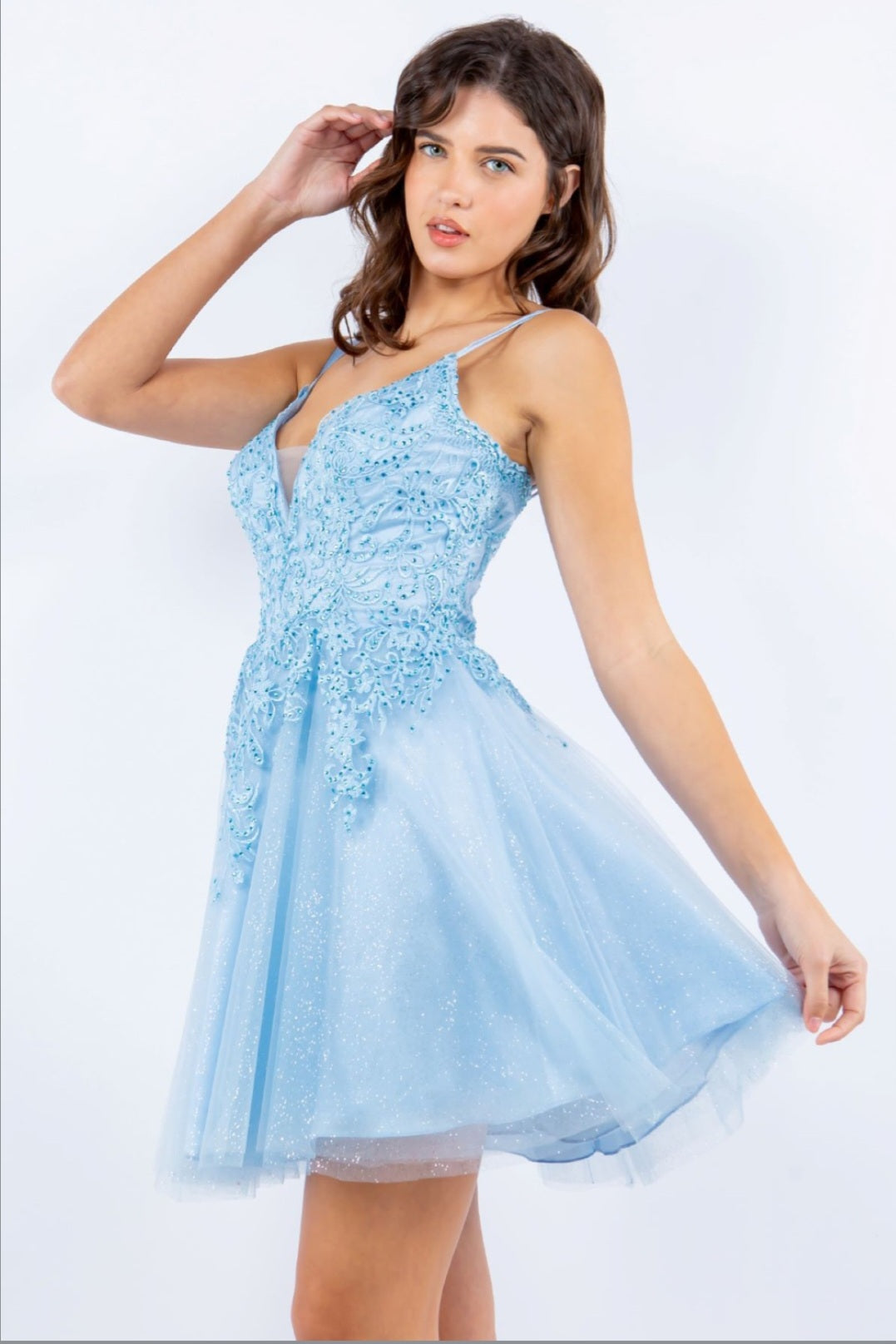 This beautiful short A-line party dress features a double spaghetti, rhinestone embroidered bodice and glitter tulle skirt. With a plunging neckline and a lace-up back, this mini dress is a great pick for homecoming, cocktail party, damas or any special occasion.