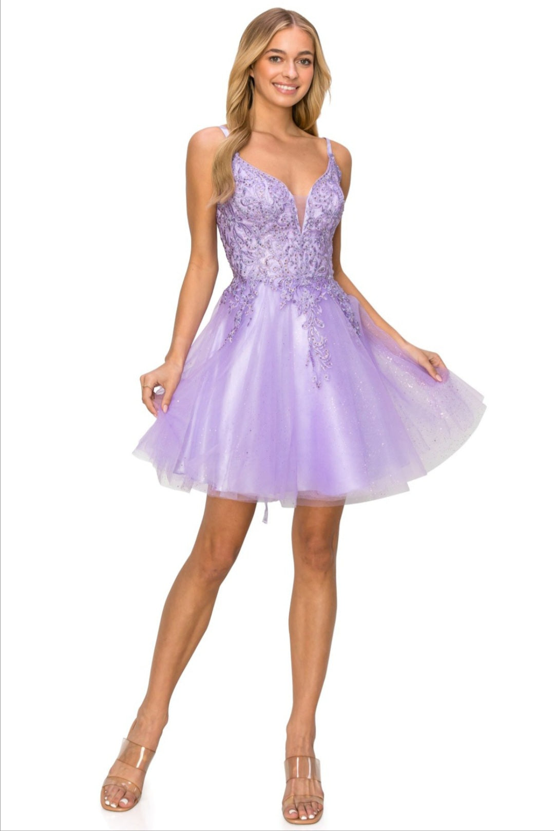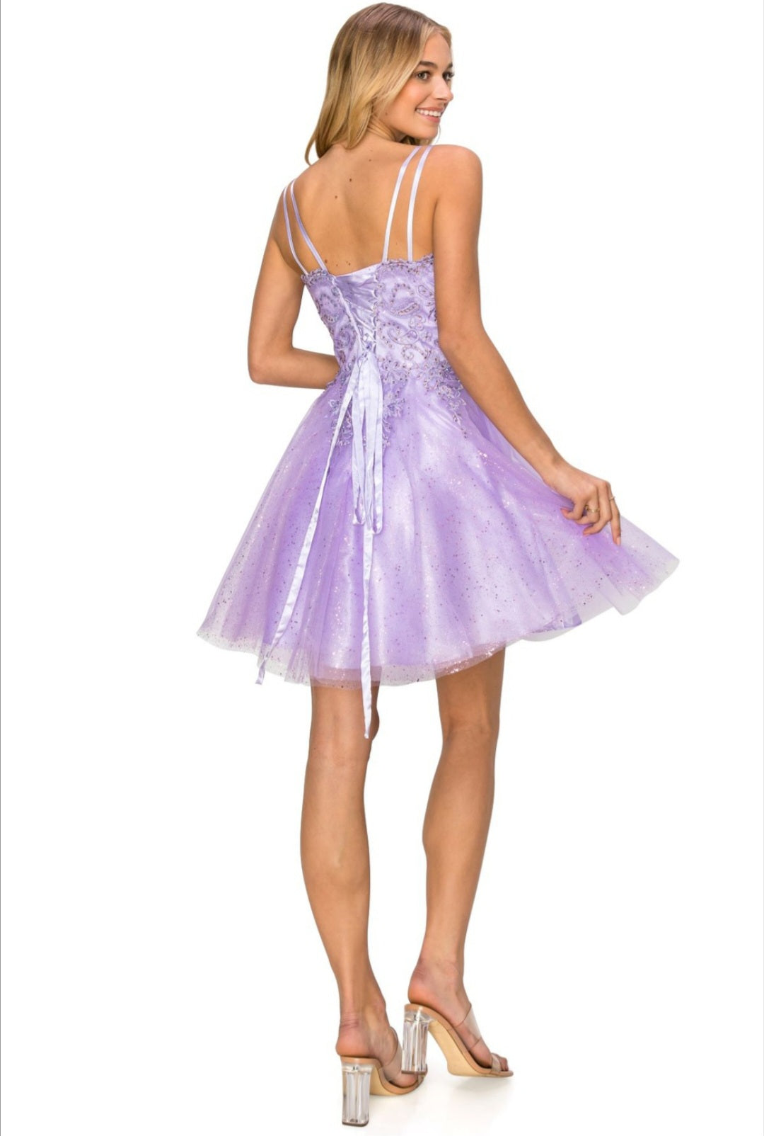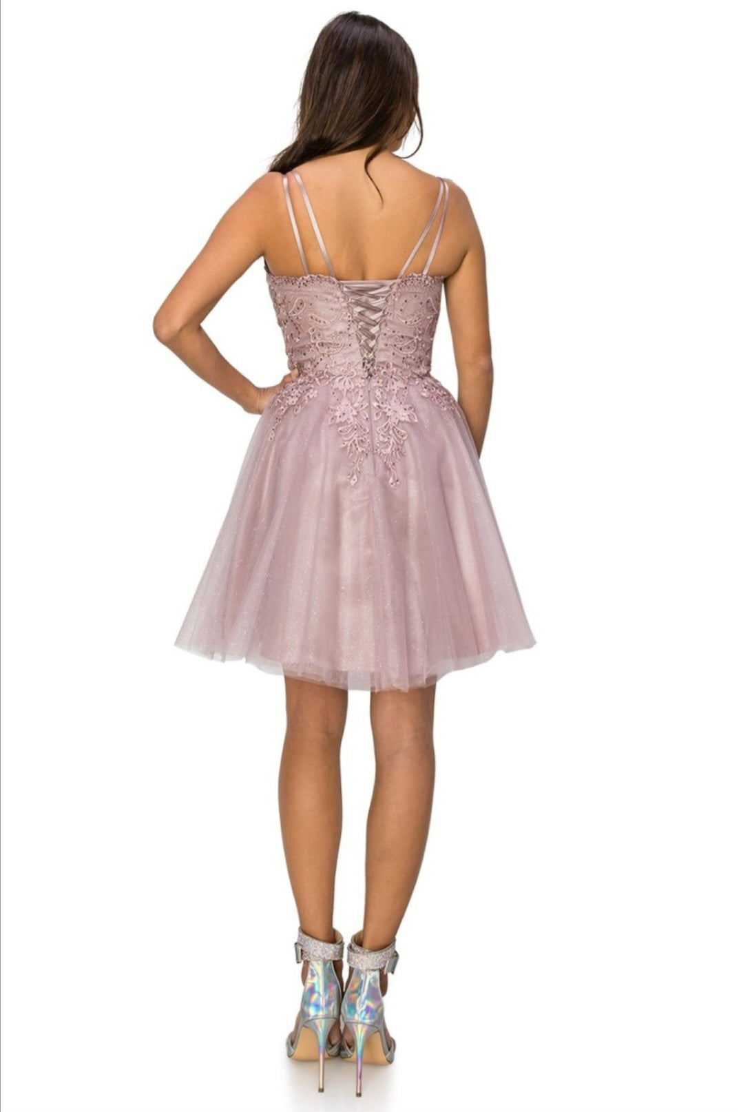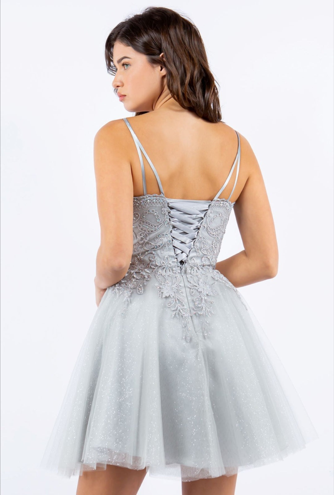 This beautiful short A-line party dress features a double spaghetti, rhinestone embroidered bodice and glitter tulle skirt. With a plunging neckline and a lace-up back, this mini dress is a great pick for homecoming, cocktail party, damas or any special occasion.
