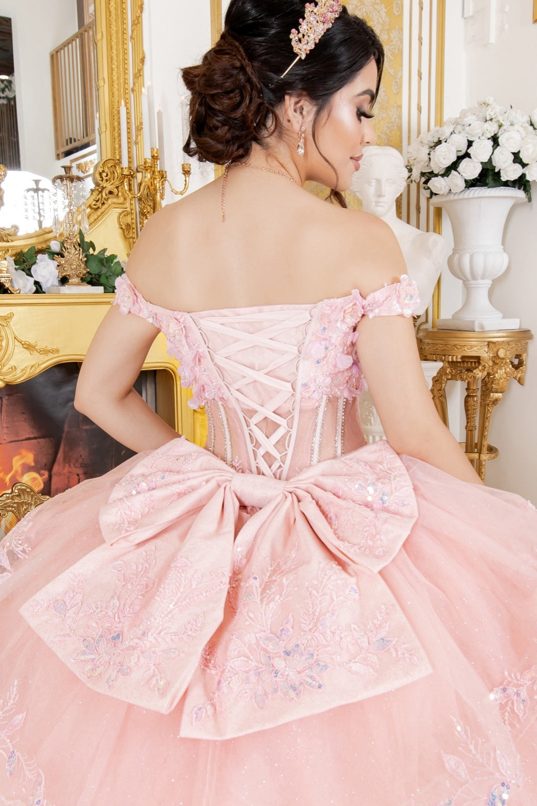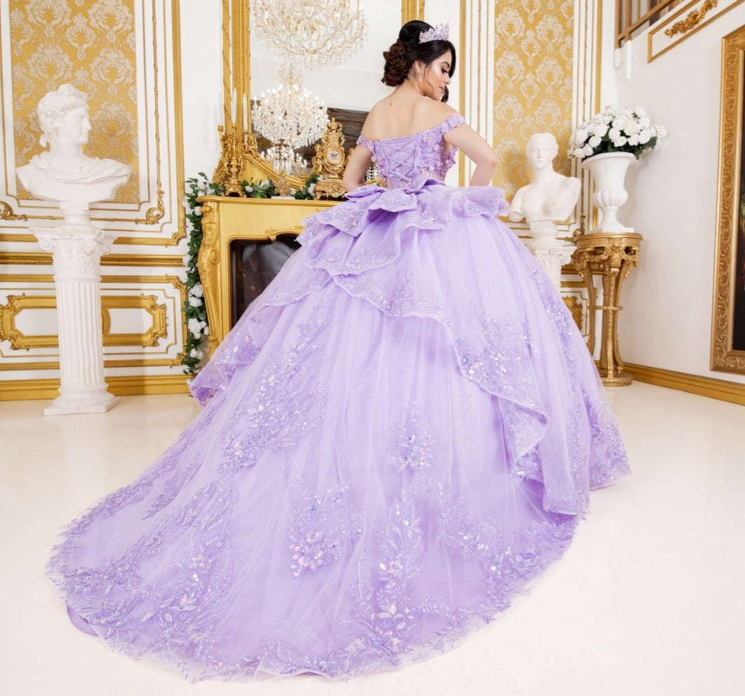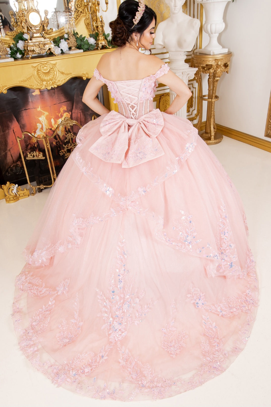 This lovely Quinceanera ball gown with three-dimensional floral appliques with beaded lace gives you an angelic look, featuring a sweetheart neckline and off-the-shoulder design. This dress includes detachable back ribbon.