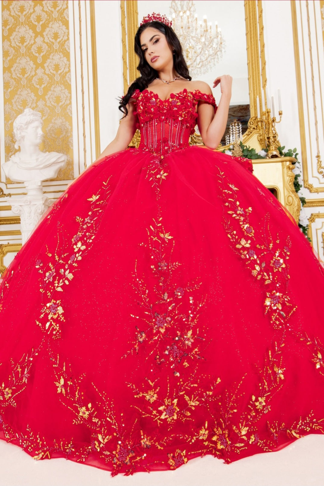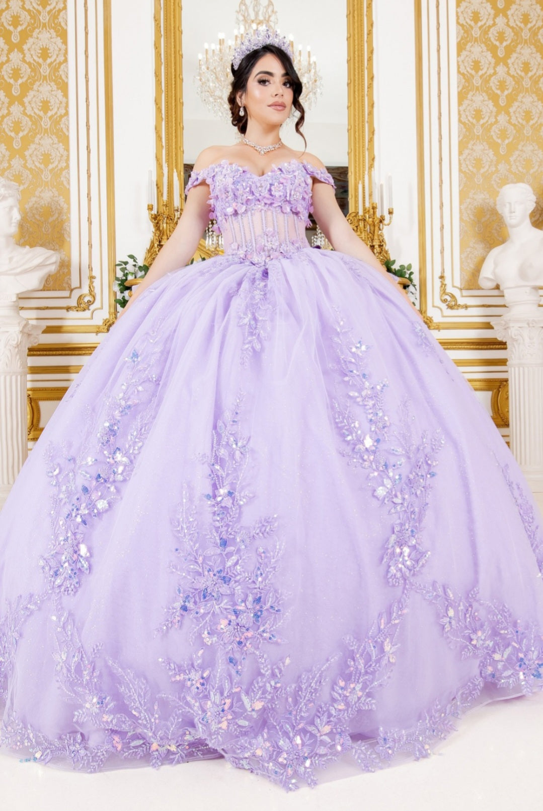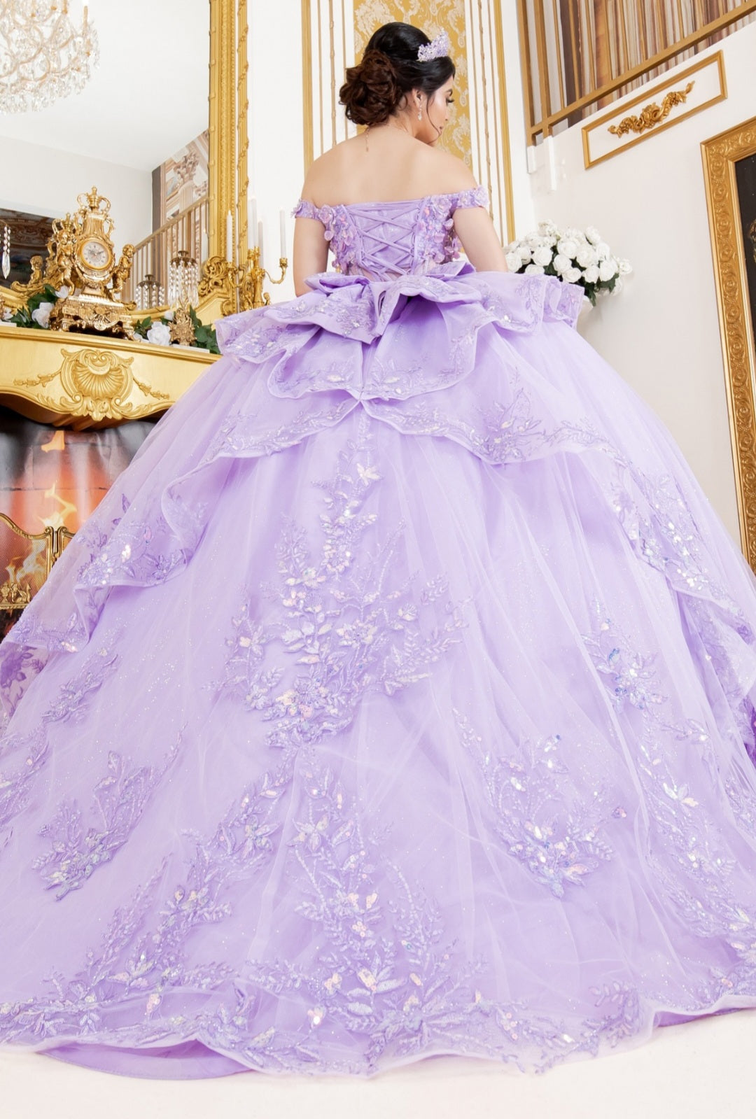 This lovely Quinceanera ball gown with three-dimensional floral appliques with beaded lace gives you an angelic look, featuring a sweetheart neckline and off-the-shoulder design. This dress includes detachable back ribbon.