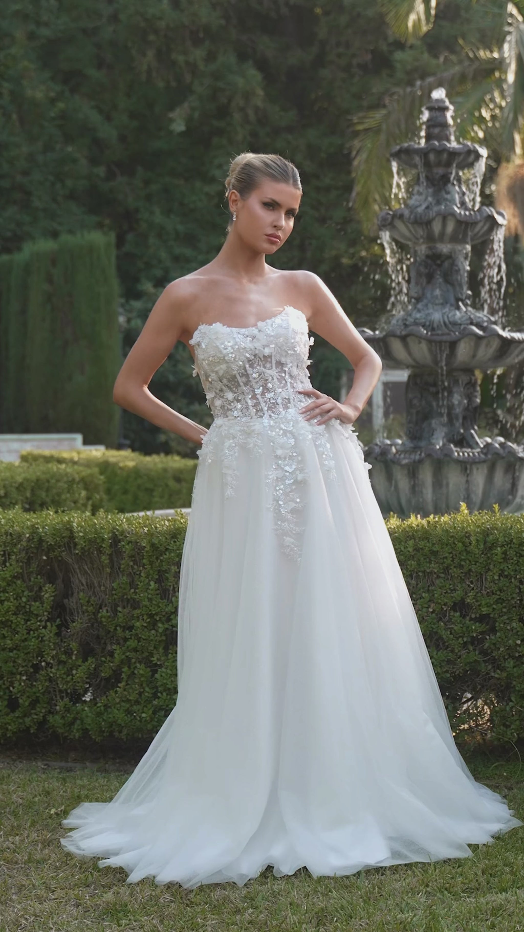 Radiating romance, this airy A-line gown features a strapless sweetheart neckline and soft 3D floral appliqué that trails delicately across the bodice. The sheer corset adds a touch of modern allure, complemented by dimensional lace that brings texture and artistry to every angle. Flowing layers of lightweight tulle create ethereal movement with each step, while the lace-up corset back ensures a customizable, secure fit—perfect for the bride seeking timeless beauty with a contemporary twist.