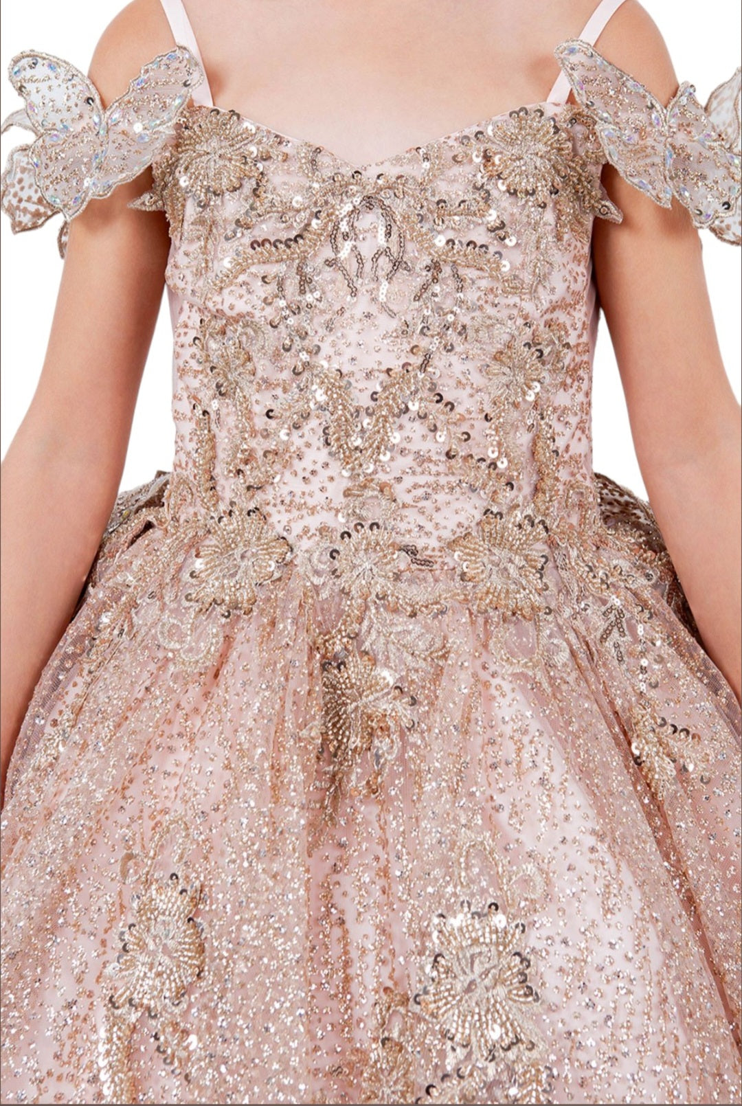 This gorgeous off-the-shoulder, long-sleeved ball gown is an enchanting piece of work that will make you look like a mini Quinceanera princess! The crafted lace and beaded applique add the perfect amount of shine to the bodice. Adding to the charm of this dress are the dimensional floral appliques giving it a unique and creative flair. It has a layered tulle full skirt with tiered train detail completed with intricate lace appliques.
