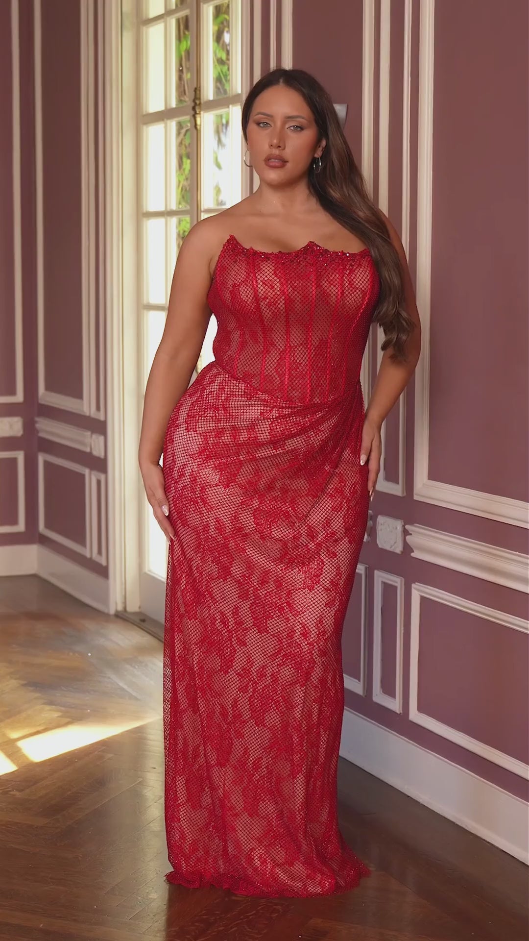 Designed for standout glamour, this fully beaded gown is reimagined for curves—offering a sleek, figure-flattering silhouette that celebrates every shape. The strapless scoop neckline pairs with a shimmering mesh overlay for a radiant, high-fashion look, while the thigh-high slit brings movement and confidence. Finished with a supportive lace-up back, this gown delivers both structure and show-stopping appeal, perfect for any event where you want to feel powerful and unforgettable.