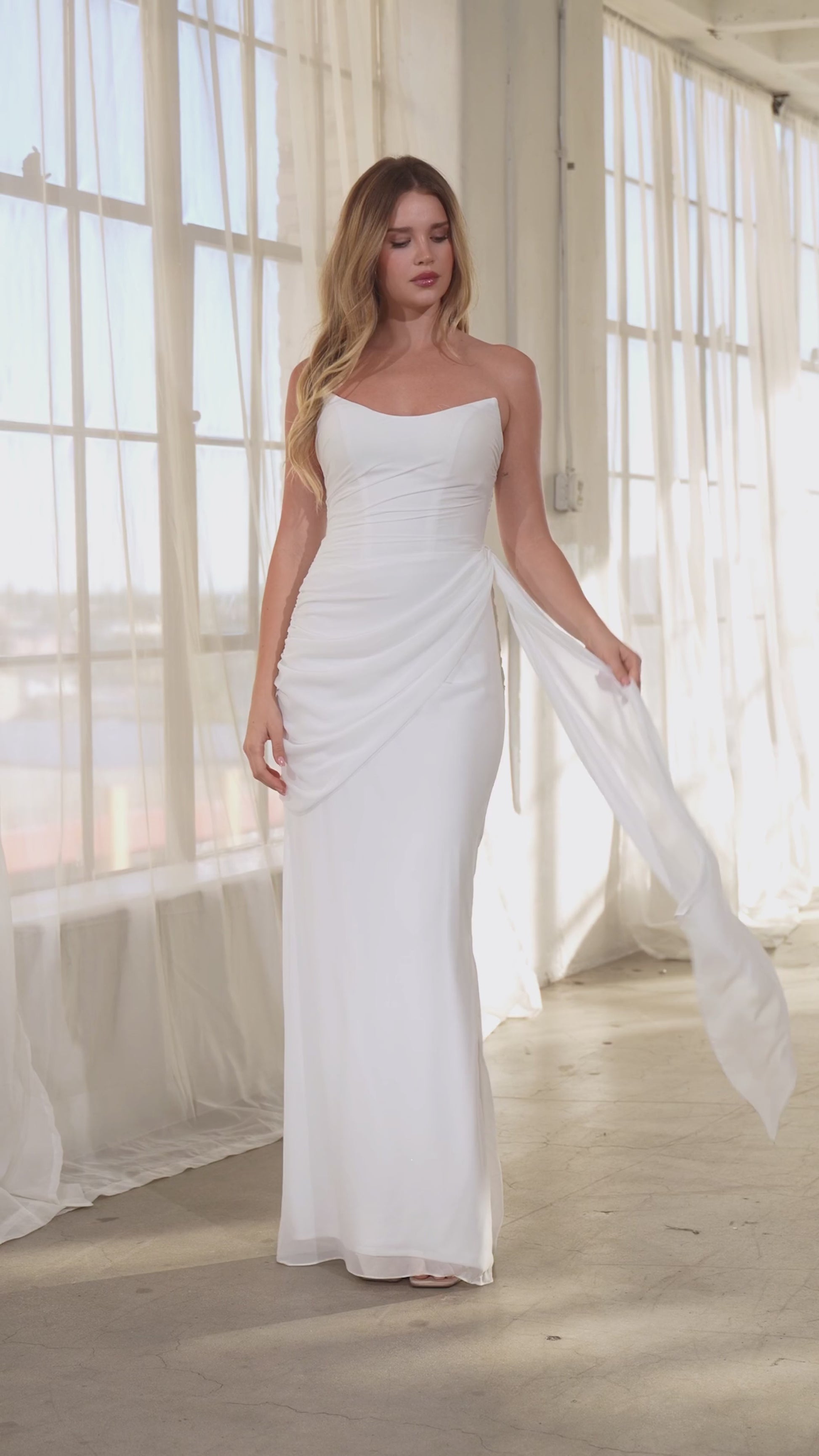 Soft, romantic, and effortlessly timeless — this strapless chiffon gown is crafted for modern brides who want elegance without the fuss. The sculpted bodice and flattering draped silhouette create a graceful, elongated shape, while the cascading side sash adds movement for aisle-ready drama. Lightweight chiffon keeps the gown airy and comfortable from ceremony to reception, and the lace-up back allows for a customizable, secure fit. A beautiful choice for civil weddings, destination ceremonies, rehearsal dinners, bridal portraits, or minimalist brides seeking a chic, refined look.