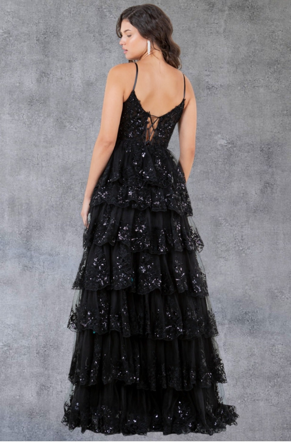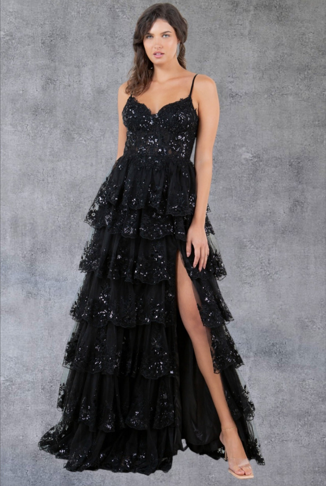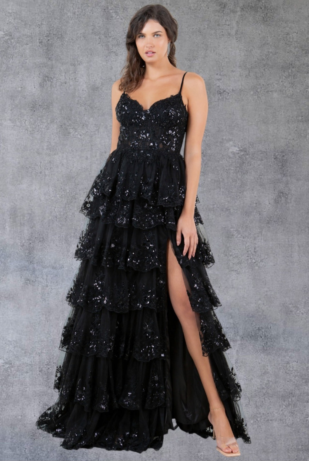 Exquisite evening gown with a romantic, soft, feminine silhouette. The bodice is adorned with intricate beadwork and sequins adding a touch of sparkle and sophistication with a layered tulle ruffle, each tier accented with subtle sequin details. The combination of the fitted bodice and the voluminous, tiered skirt create elegance and stunning perfect dress.