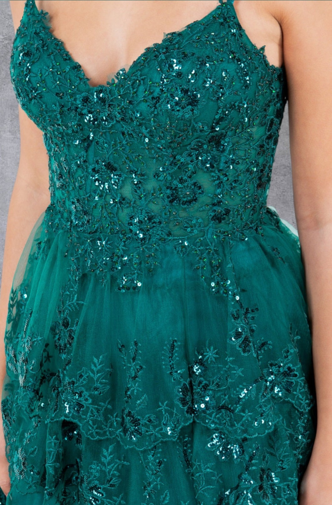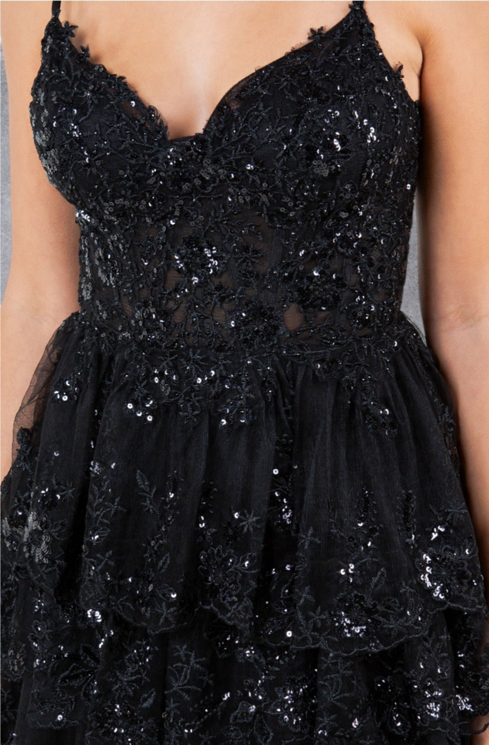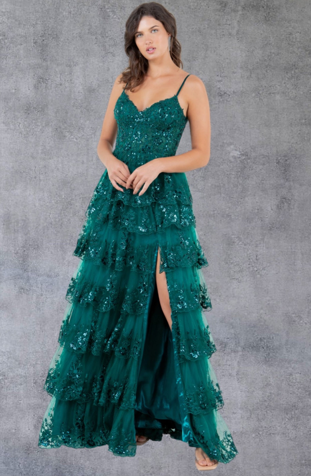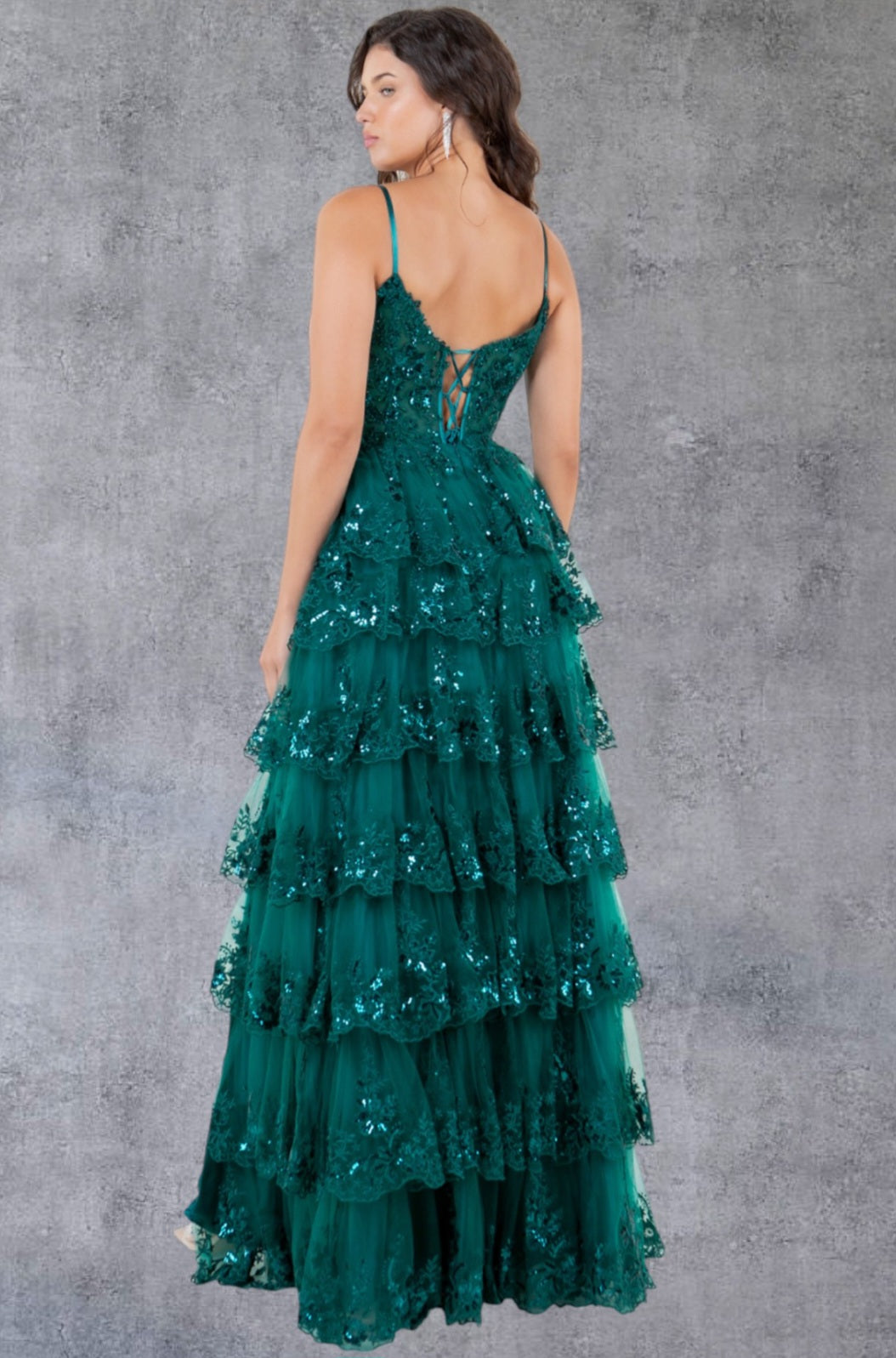 Exquisite evening gown with a romantic, soft, feminine silhouette. The bodice is adorned with intricate beadwork and sequins adding a touch of sparkle and sophistication with a layered tulle ruffle, each tier accented with subtle sequin details. The combination of the fitted bodice and the voluminous, tiered skirt create elegance and stunning perfect dress.
