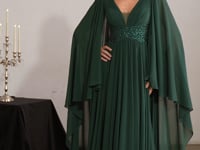 Crafted with elegance in mind, this flowing chiffon gown features a softly pleated V-neckline and a delicately beaded waistline that catches the light with subtle sparkle. The draped cape sleeves add graceful movement and timeless sophistication, creating an effortless blend of comfort and refinement. With a flattering A-line silhouette and fluid skirt, this gown offers ease and confidence—perfect for celebrating unforgettable moments.