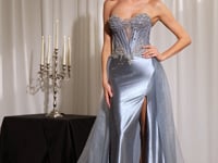 Designed to mesmerize, this gown delivers two unforgettable looks in one. The strapless corset bodice is adorned with sparkling beadwork and crystal appliqué, creating a sculpted silhouette that glows under every light. A sleek satin skirt with a thigh-high slit adds confidence and movement, while the detachable tulle overskirt transforms the gown from runway-sleek to dramatic and red-carpet ready — making it the perfect statement piece for prom night.