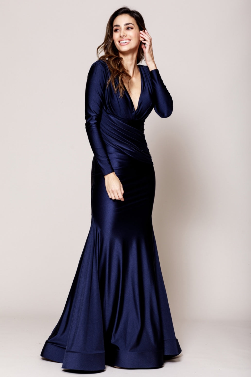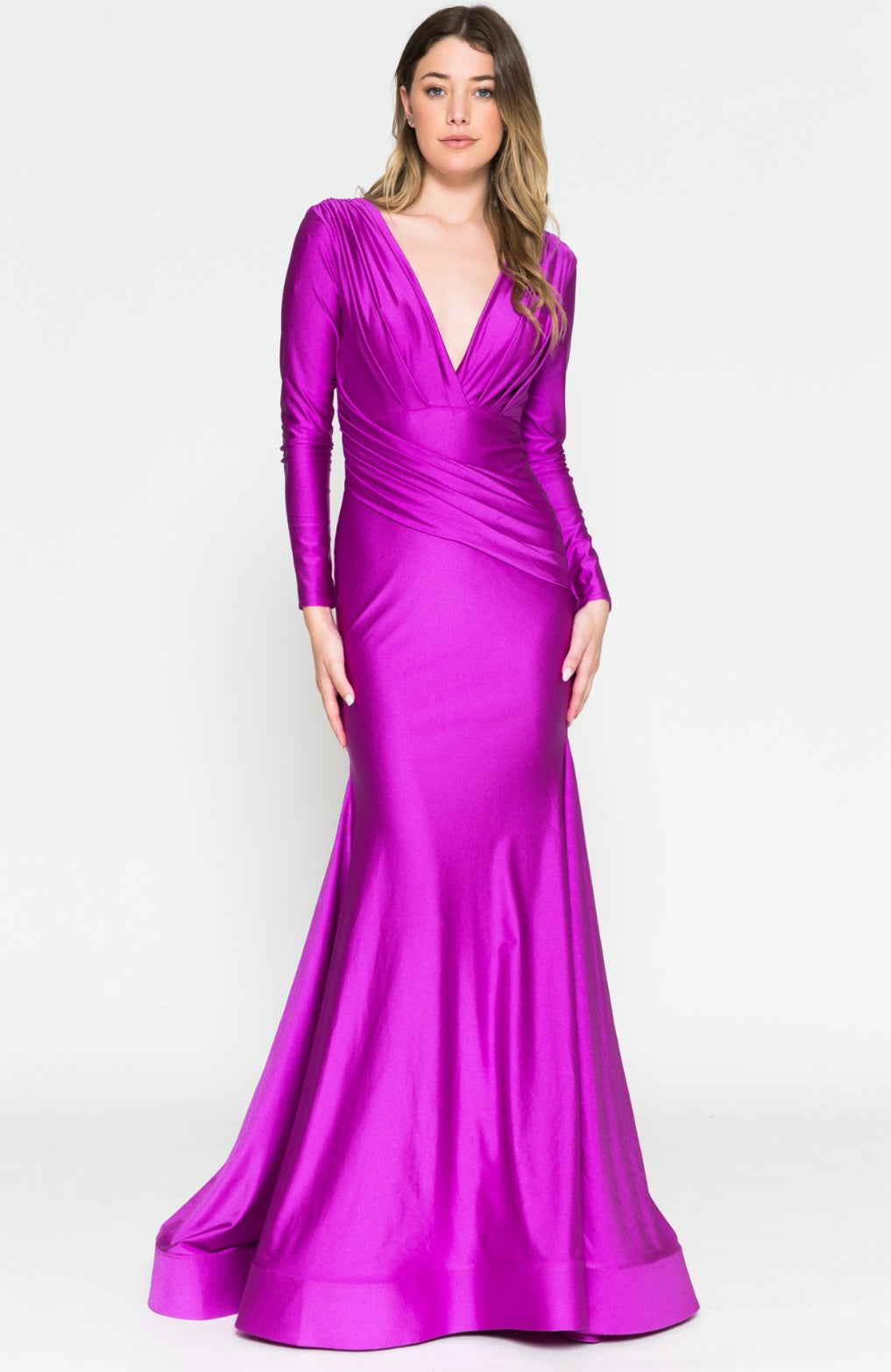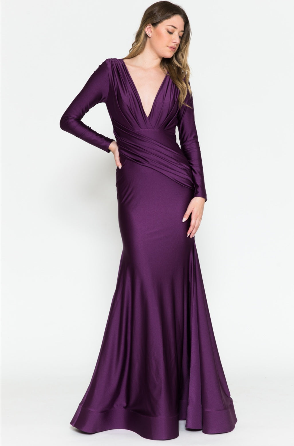 Imagine yourself in this beautiful floor length fitted jersey evening gown for your next formal event. This long sleeve formal sheath dress has a sexy deep V-neckline and features a gathered waistline and open V-back.