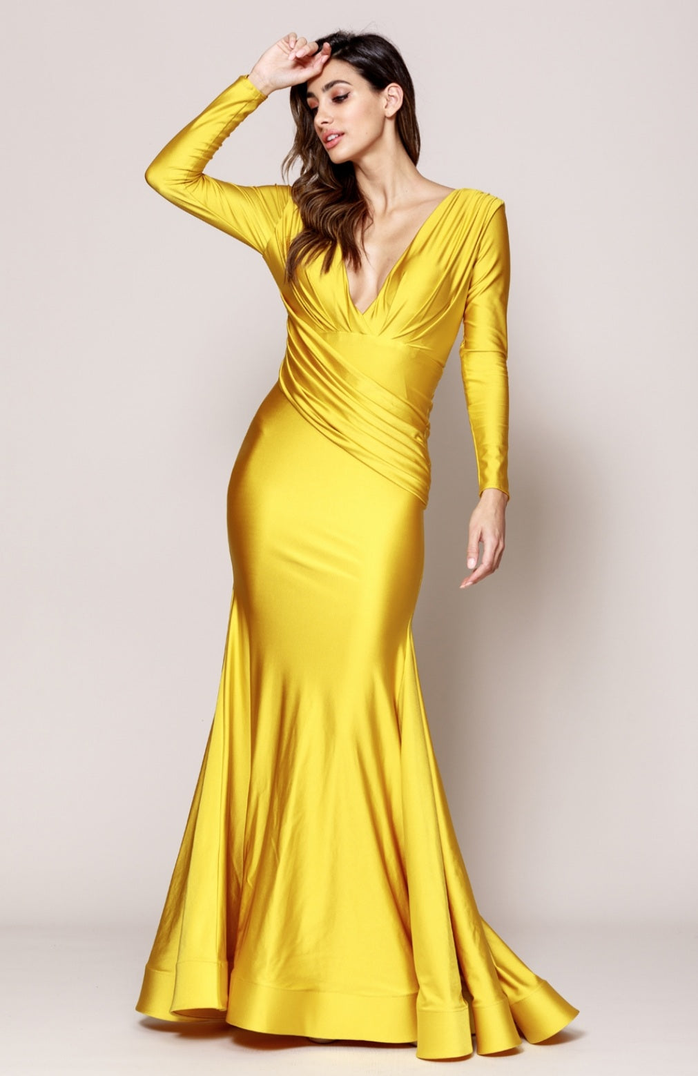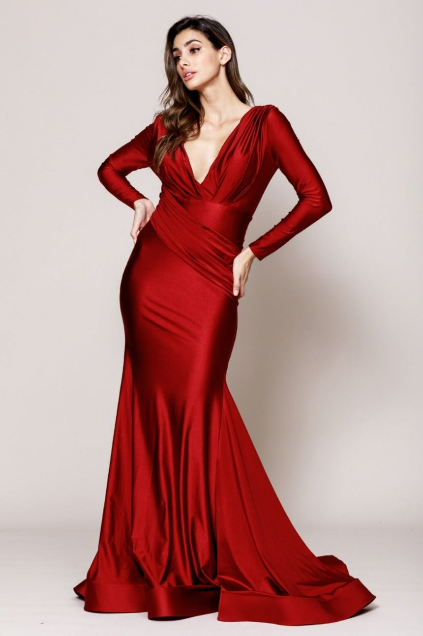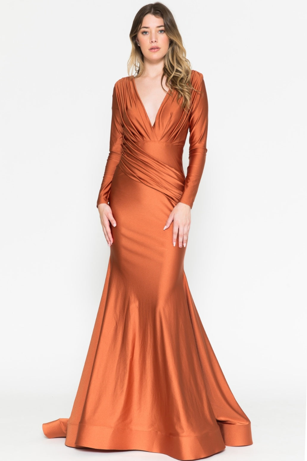 Imagine yourself in this beautiful floor length fitted jersey evening gown for your next formal event. This long sleeve formal sheath dress has a sexy deep V-neckline and features a gathered waistline and open V-back.