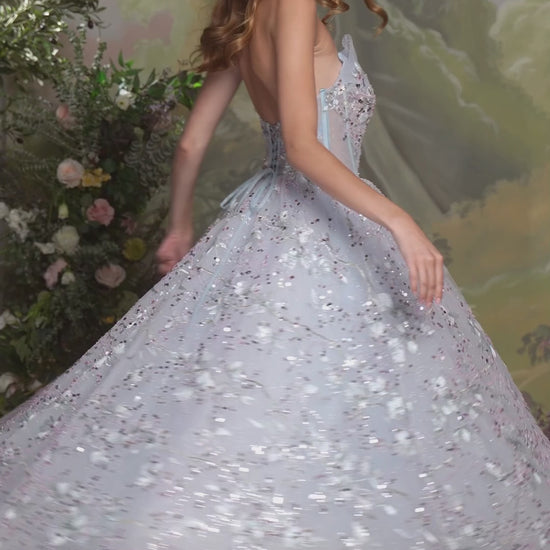 This romantic A-line gown captures a fairytale essence with its soft pastel hues and shimmering floral embroidery. The strapless sweetheart neckline and structured bodice flatter the figure, while the delicate sequin and bead embellishments glisten over layers of airy tulle. Finished with a mid-length skirt that moves gracefully with every step, this gown is a perfect choice for garden parties, formal soirées, or any whimsical celebration.