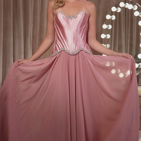 This enchanting ball gown combines timeless elegance with regal sophistication. Designed with a sculpted satin corset bodice, it features delicate crystal embellishments that trace along the neckline and waist for a touch of radiant sparkle. The strapless design highlights the décolletage, while the full chiffon skirt flows gracefully with every step. A lace-up back ensures a customizable fit, making this gown perfect for prom, galas, or any grand occasion.