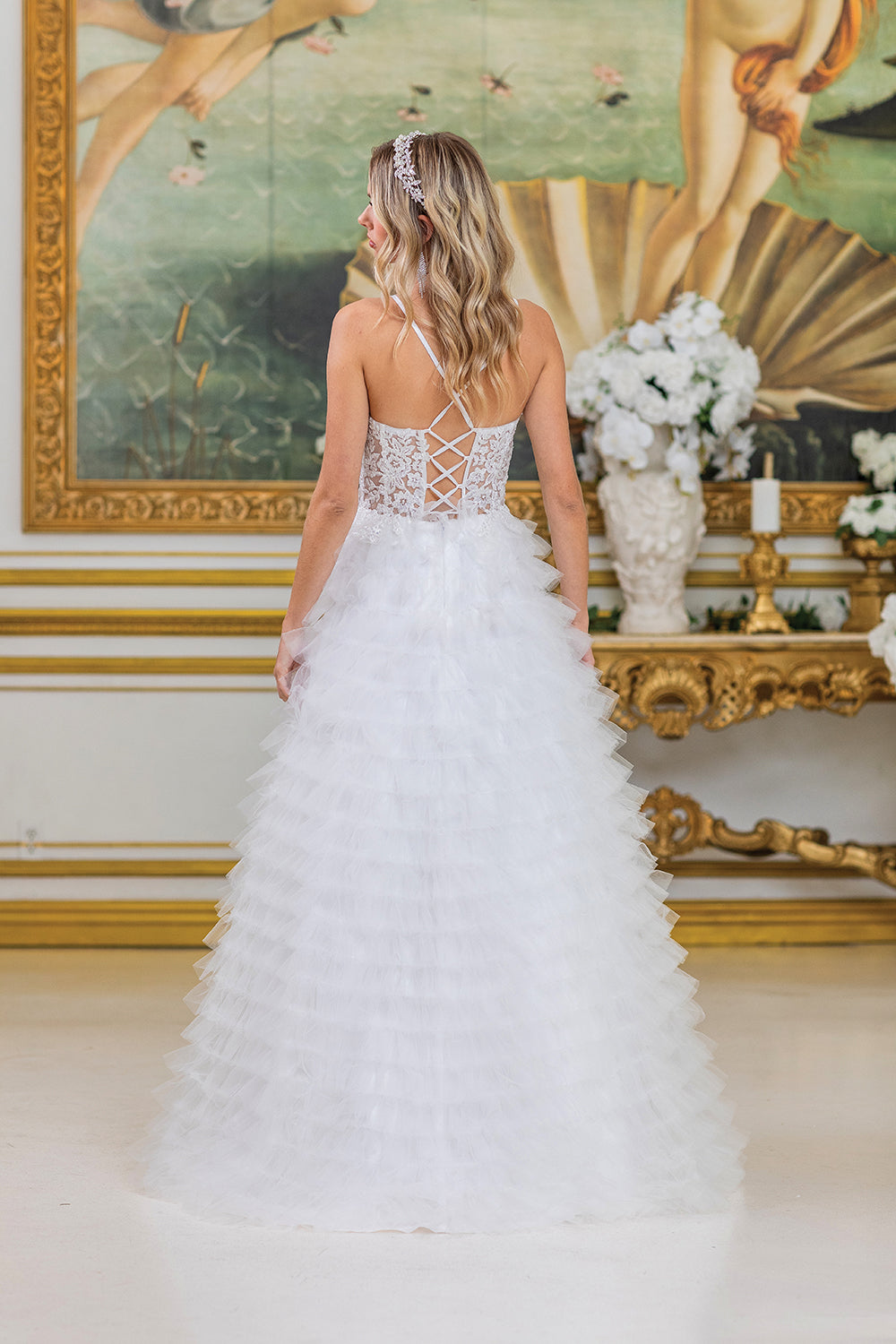 • Design: Sweetheart neckline, beaded bodice layered of ruffle tulle, thin straps and lace-up back