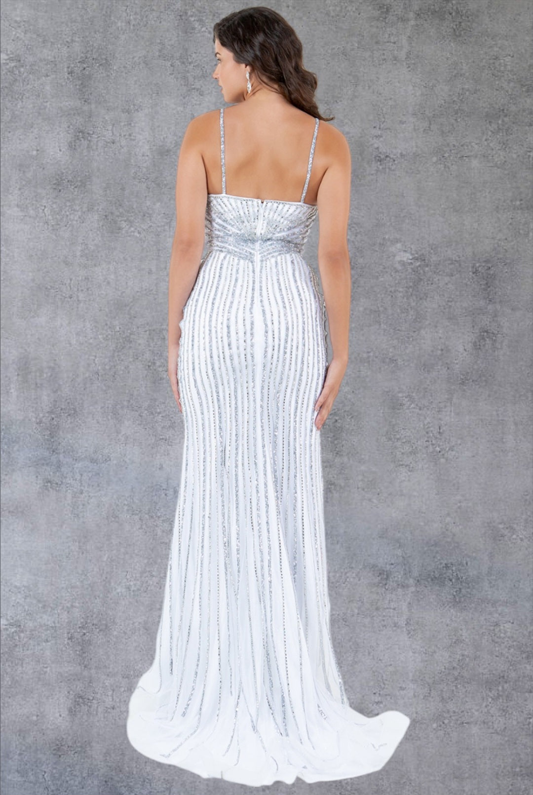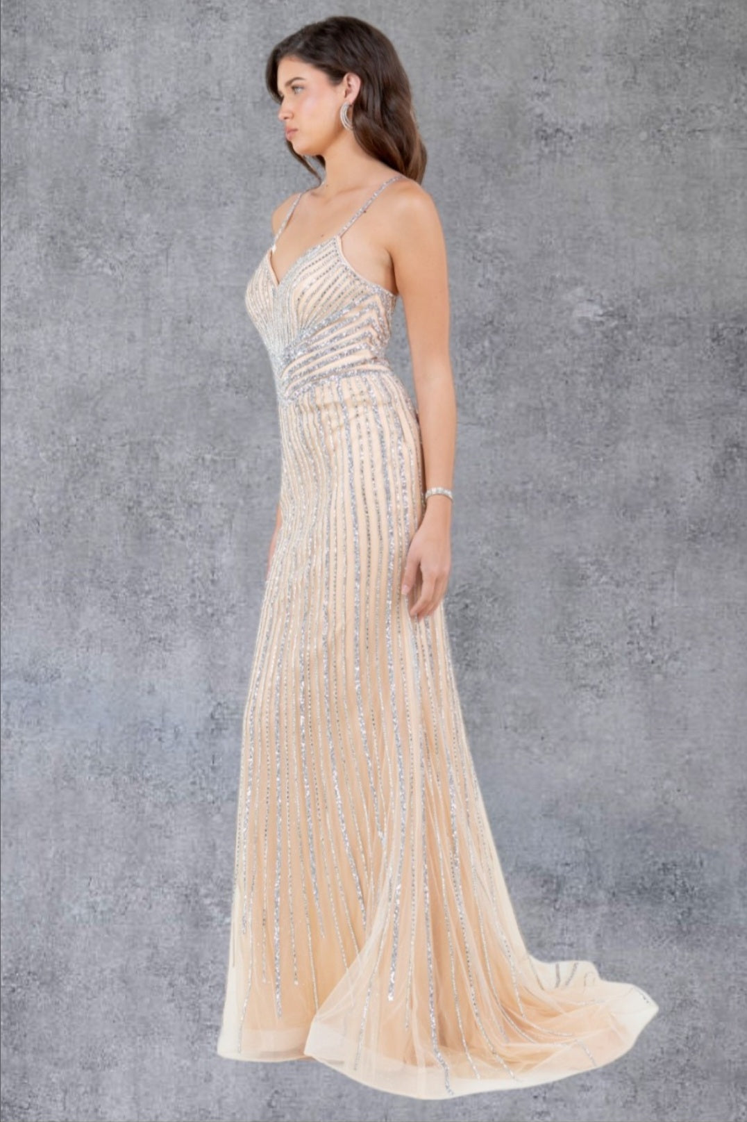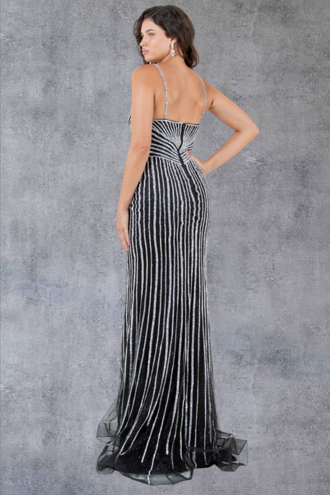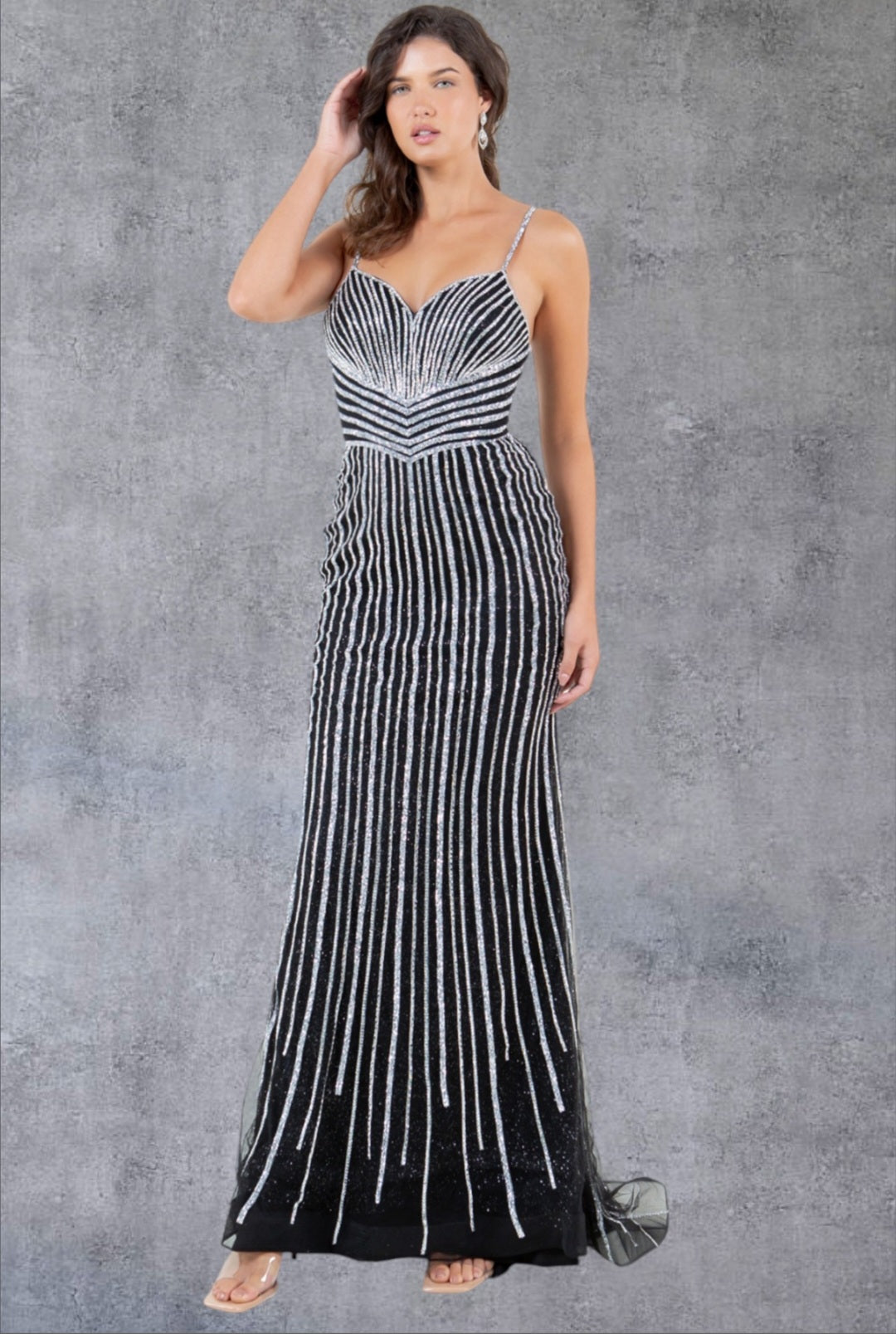 Elegant gown with vertical silver stripes running down the length of the dress that features a sweetheart neckline with thin shoulder straps and has a fitted bodice, creating a flattering silhouette. The silver stripes are more concentrated and intricate around the bodice area, highlighting the shape of the top. The skirt of the gown flows smoothly, with the vertical lines elongating the overall appearance. Perfect for prom, gala, or any special occasion.