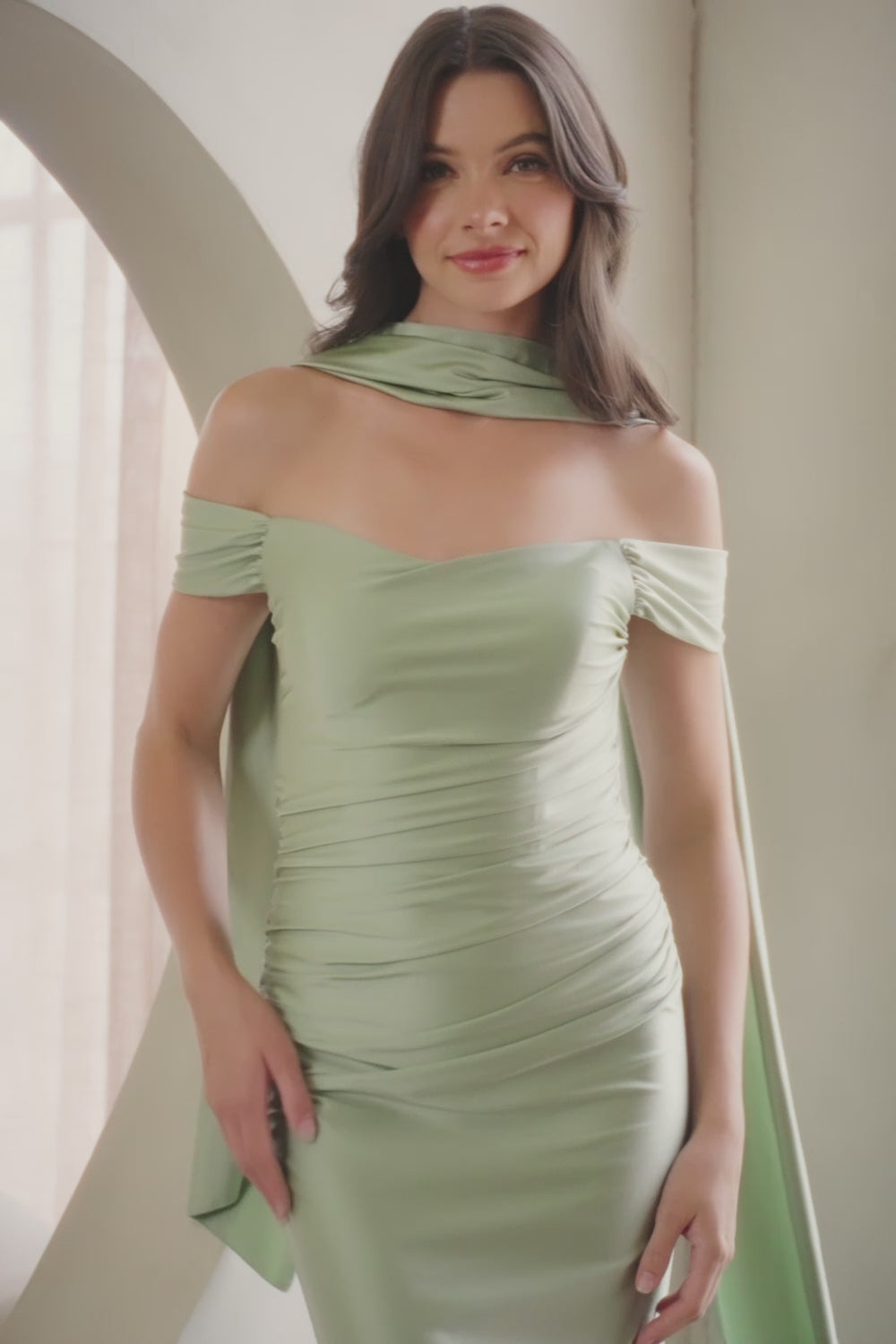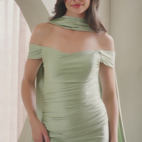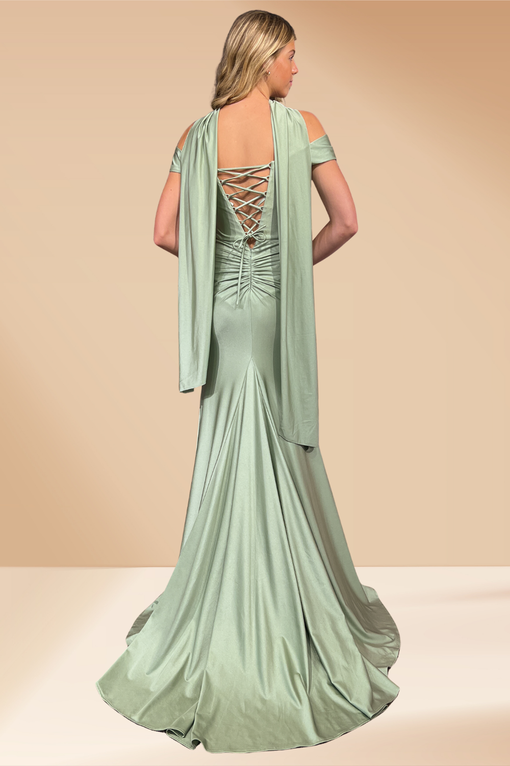 This fitted gown showcases an off-the-shoulder scoop neckline, beautifully complementing the ruched waist, lace-up back and hipline for a flattering silhouette with matching scarf. Crafted from stretch jersey, the fit-and-flare design effortlessly enhances your natural shape while allowing graceful movement. Perfect for weddings, bridesmaids, or formal events, this elegant dress offers a timeless and sophisticated look.