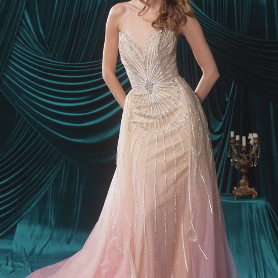 Elevate every entrance with this couture-inspired masterpiece. This fitted gown showcases a sculpted sweetheart neckline and a celestial ombre pattern that glimmers from every angle. A sheer, layered overskirt flows effortlessly over the embellished silhouette, adding depth, movement, and a touch of romantic drama. Finished with a supportive structured bodice and flattering corsetry, this gown is the perfect blend of luxury and artistry—ideal for prom, pageants, or any evening where you want to truly shine.