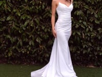 - Design: Strapless pointed V-neckline, gathered waistline, leg slit